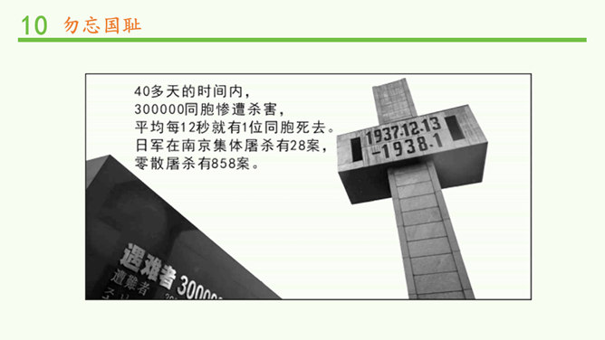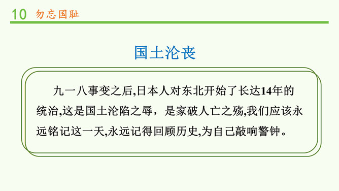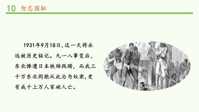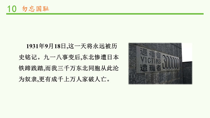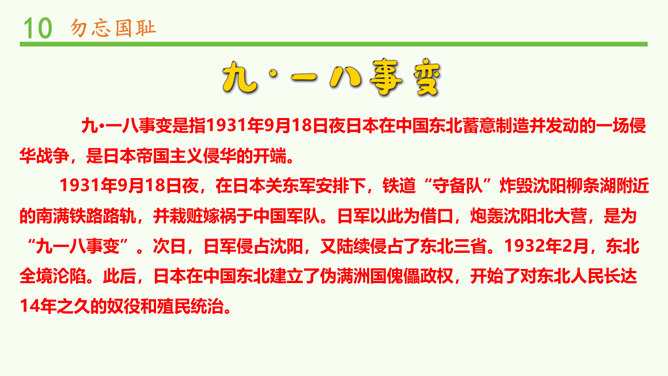 九·一八事变是指1931年9月18日夜日本在中国东北蓄意制造并发动的一场侵华战争,是日本帝国主义侵华的开端。1931年9月18日夜,在日本关东军安排下,铁道“守备队”炸毁沈阳柳条湖附近的南满铁路路轨,并栽赃嫁祸于中国军队。日军以此为借口,炮轰沈阳北大营,是为“九一八事变”。次日,日军侵占沈阳,又陆续侵占了东北三省。1932年2月,东北全境沦陷。此后,日本在中国东北建立了伪满洲国傀儡政权,开始了对东北人民长达14年之久的奴役和殖民统治。所属专题:夺取抗日战争和人民解放战争的胜利ppt。
