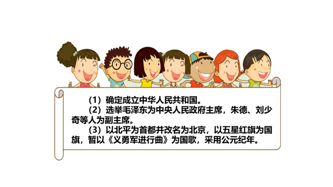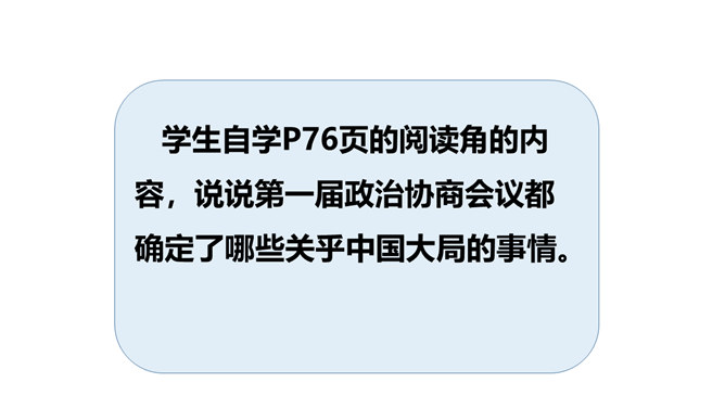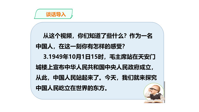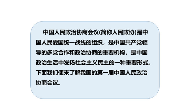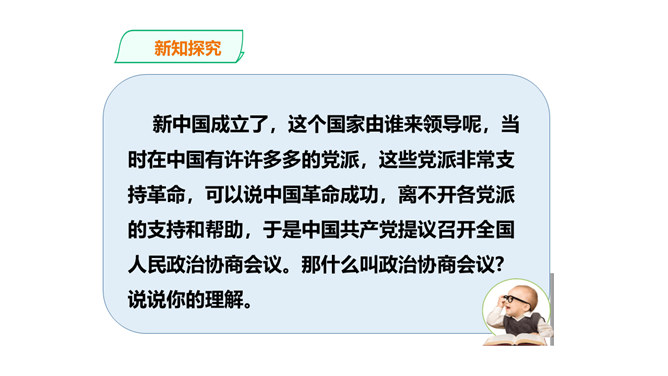 1949年10月1日15时,毛主席站在天安门城楼上宣布中华人民共和国中央人民政府成立,从此,中国人民站起来了。今天,我们就来探究中国人民屹立在世界的东方。新中国成立了,这个国家由谁来领导呢,当时在中国有许许多多的党派,这些党派非常支持革命,可以说中国革命成功,离不开各党派的支持和帮助,于是中国共产党提议召开全国人民政治协商会议。那什么叫政治协商会议?说说你的理解。中国人民政治协商会议(简称人民政协)是中国人民爱国统一战线的组织,是中国共产党领导的多党合作和政治协商的重要机构。所属专题:屹立在世界的东方ppt。