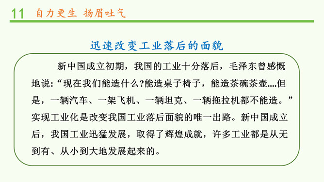 新中国成立初期,我国的工业十分落后,毛泽东曾感慨地说:“现在我们能造什么?能造桌子椅子,能造茶碗茶壶....但是,一辆汽车、一架飞机、一辆坦克、一辆拖拉机都不能造。”实现工业化是改变我国工业落后面貌的唯一出路。新中国成立后,我国工业迅猛发展,取得了辉煌成就,许多工业都是从无到有、从小到大地发展起来的。说一说为什么邓稼先要回到祖国。为什么明知有核辐射的致命伤害却依然要去亲自查看?中国共产党的领导下,全国各族人民以极大的热情和自力更生、艰苦奋斗、百折不挠的精神投身于社会主义建设。所属专题:屹立在世界的东方ppt。