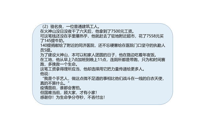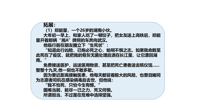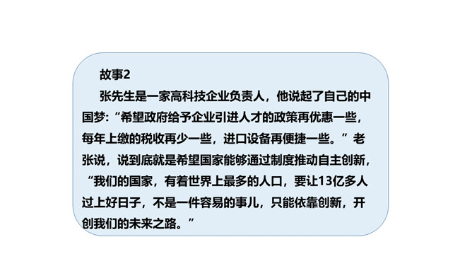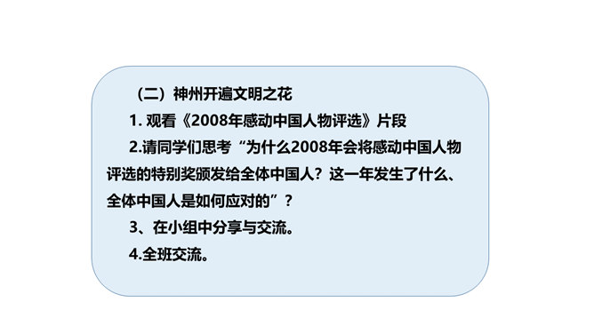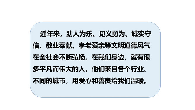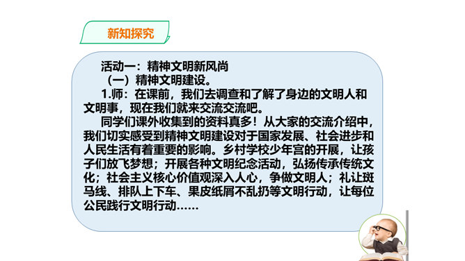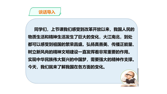 上节课我们感受到改革开放以来,我国人民的物质生活和精神生活发生了巨大的变化,大江南北,到处都可以感受到祖国的繁荣昌盛。弘扬真善美、传播正能量、树立新风尚的精神文明建设一直发挥着非常重要的作用。实现中华民族伟大复兴的中国梦,需要强大的精神作支撑。今天,我们就来了解我国在各方面的变化。在课前,我们去调查和了解了身边的文明人和文明事,现在我们就来交流交流吧。同学们课外收集到的资料真多!从大家的交流介绍中,我们切实感受到精神文明建设对于国家发展、社会进步和人民生活有着重要的影响。所属专题:富起来到强起来ppt。