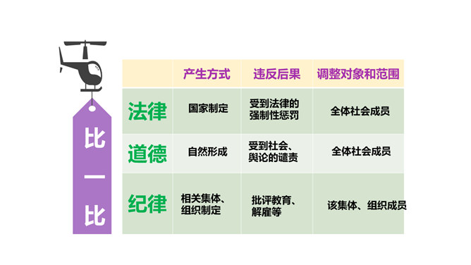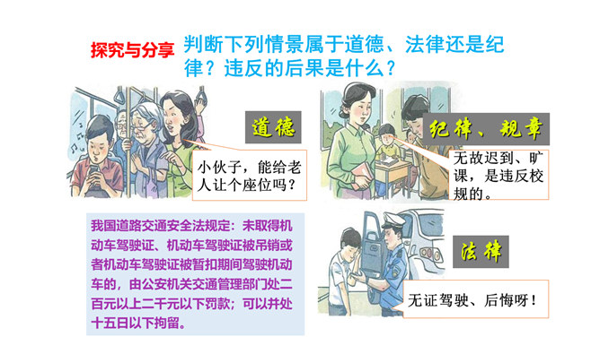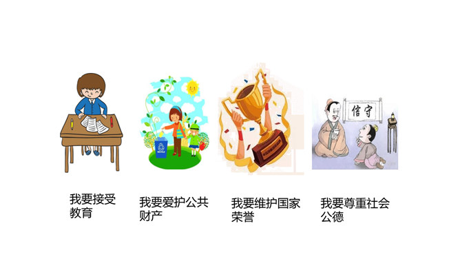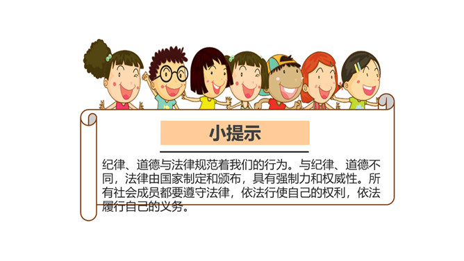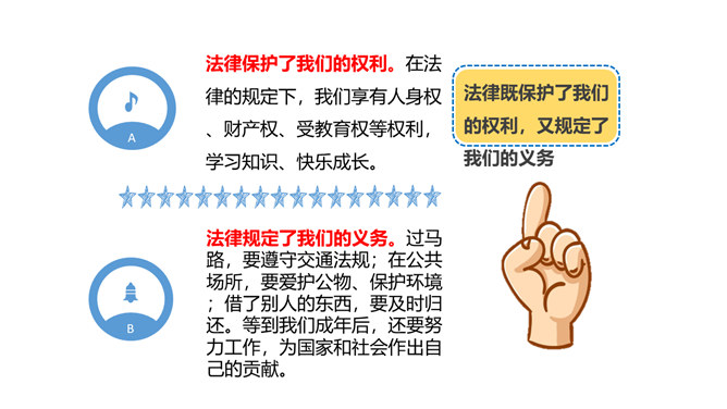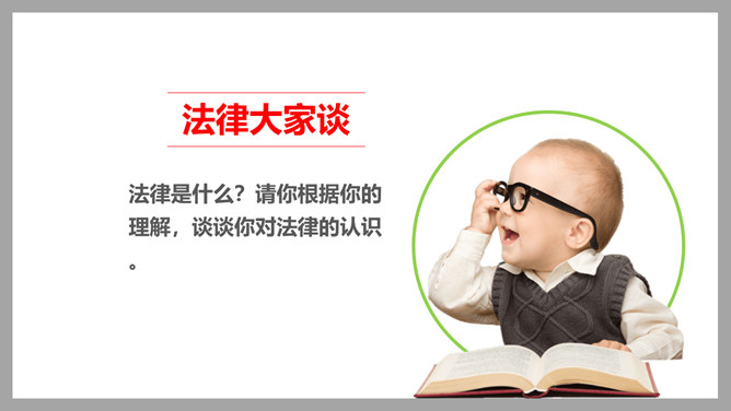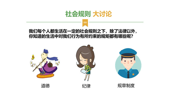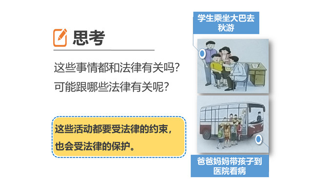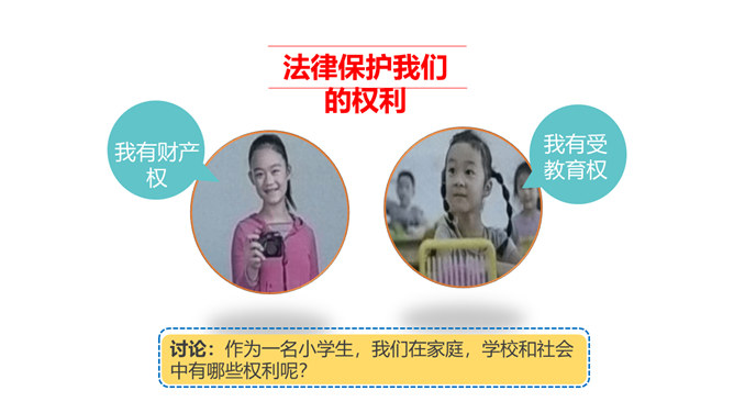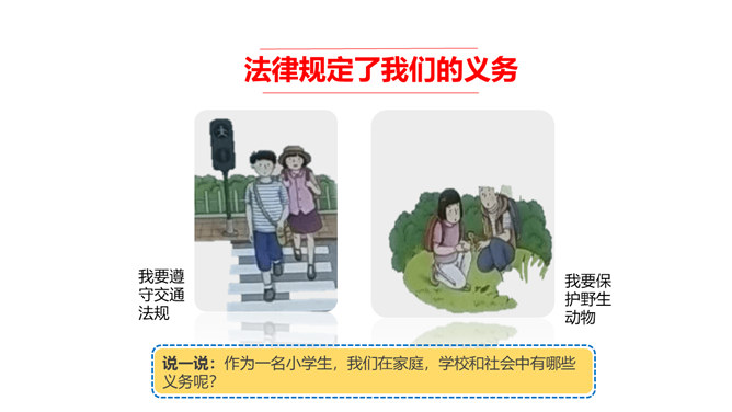 我们常说“国有国法,家有家规,无规矩不成方圆。”那么国法指的是什么呢?它和家规、规矩又有什么相同之处和不同之处呢?这些事情都和法律有关吗?可能跟哪些法律有关呢?这些活动都要受法律的约束,也会受法律的保护。法律是什么?请你根据你的理解,谈谈你对法律的认识。讨论:作为一名小学生,我们在家庭,学校和社会中有哪些权利呢?法律既保护了我们的权利,又规定了我们的义务。在法律的规定下,我们享有人身权、财产权、受教育权等权利,学习知识、快乐成长。所属专题:感受生活中的法律ppt。