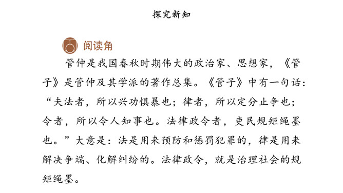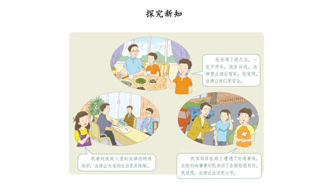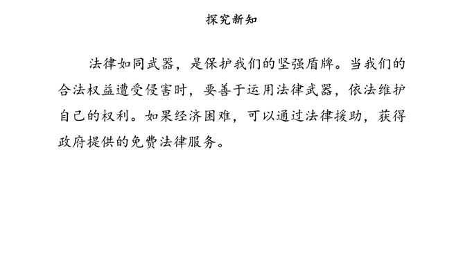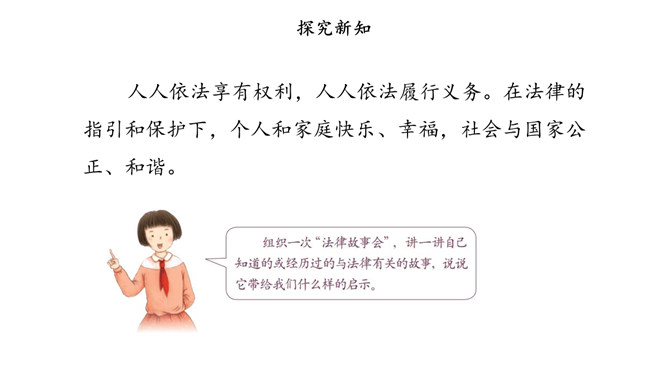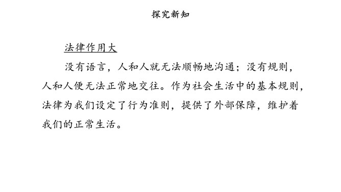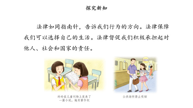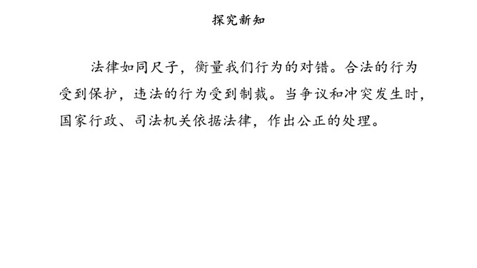 没有语言,人和人就无法顺畅地沟通;没有规则,人和人便无法正常地交往。作为社会生活中的基本规则,法律为我们设定了行为准则,提供了外部保障,维护着我们的正常生活。法律如同指南针,告诉我们行为的方向。法律保障我们可以选择自己的生活。法律督促我们积极承担起对他人、社会和国家的责任。法律如同尺子,衡量我们行为的对错。合法的行为受到保护,违法的行为受到制裁。当争议和冲突发生时,国家行政、司法机关依据法律,作出公正的处理。所属专题:感受生活中的法律ppt。