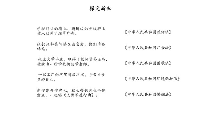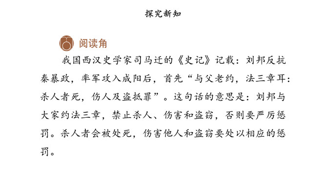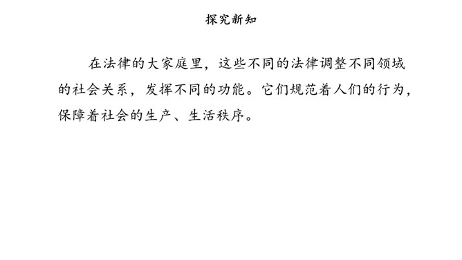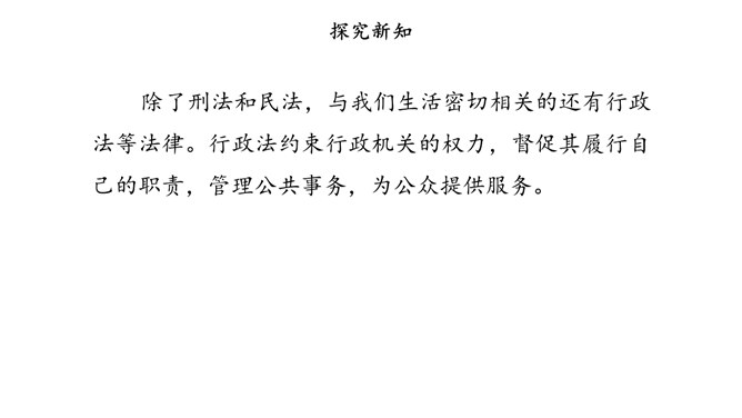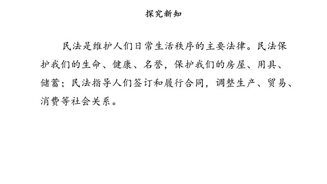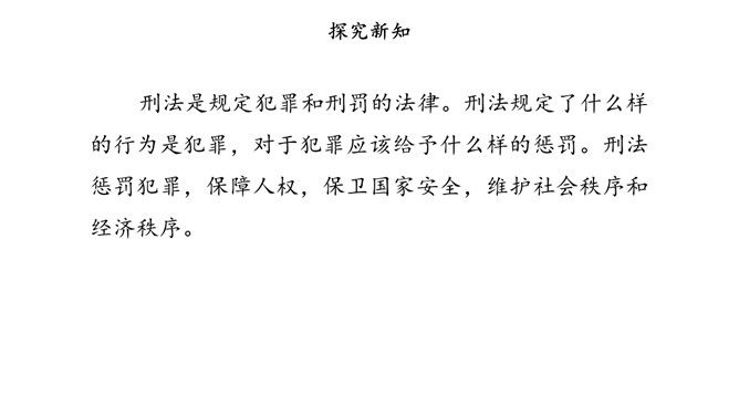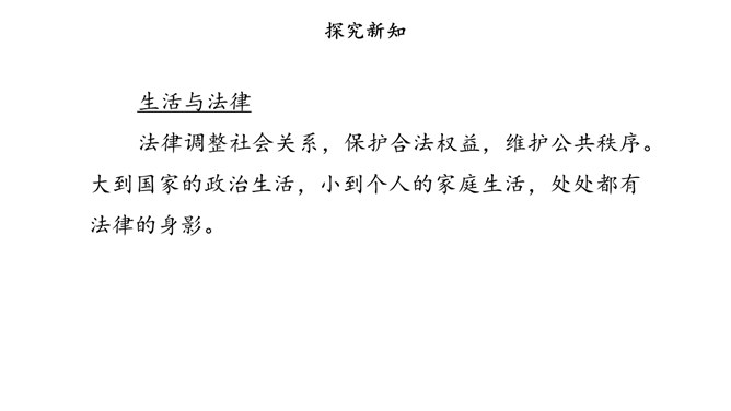 大到国家的政治生活,小到个人的家庭生活,处处都有法律的身影。刑法是规定犯罪和刑罚的法律。刑法规定了什么样的行为是犯罪,对于犯罪应该给予什么样的惩罚。刑法惩罚犯罪,保障人权,保卫国家安全,维护社会秩序和经济秩序。今天,我国的刑法规定了四百多种犯罪,包括盗窃罪、抢劫罪、绑架罪、贪污罪、交通肇事罪等。民法是维护人们日常生活秩序的主要法律。民法保护我们的生命、健康、名誉,保护我们的房屋、用具、储蓄;民法指导人们签订和履行合同,调整生产、贸易、消费等社会关系。所属专题:感受生活中的法律ppt。