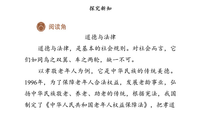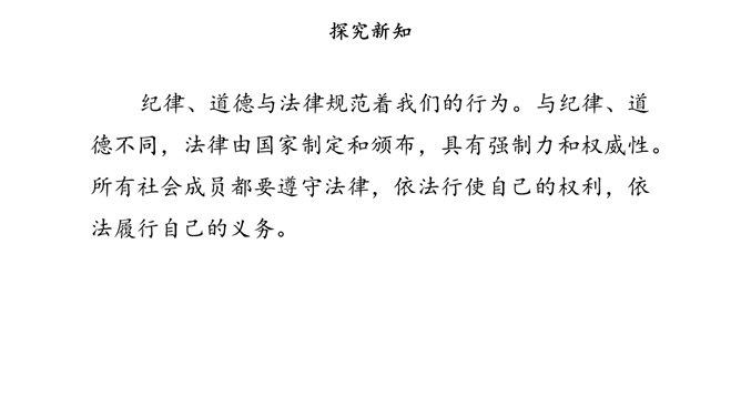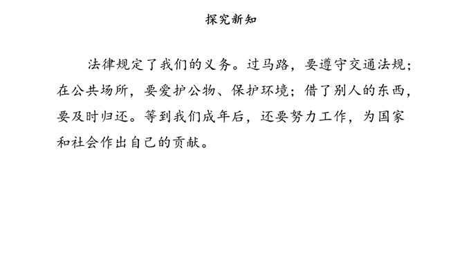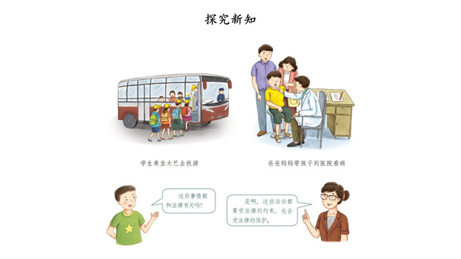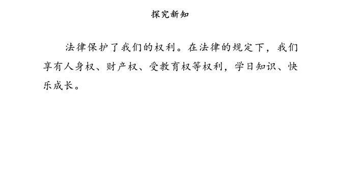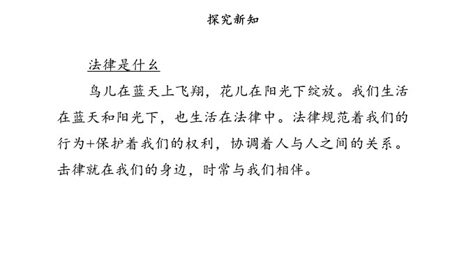 鸟儿在蓝天上飞翔,花儿在阳光下绽放。我们生活在蓝天和阳光下,也生活在法律中。法律规范着我们的行为+保护着我们的权利,协调着人与人之间的关系。击律就在我们的身边,时常与我们相伴。法律保护了我们的权利。在法律的规定下,我们享有人身权、财产权、受教育权等权利,学日知识、快乐成长。法律规定了我们的义务。过马路,要遵守交通法规;在公共场所,要爱护公物、保护环境;借了别人的东西,要及时归还。等到我们成年后,还要努力工作,为国家和社会作出自己的贡献。所属专题:感受生活中的法律ppt。