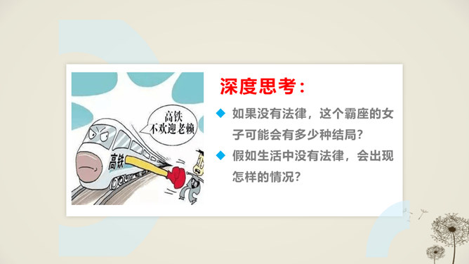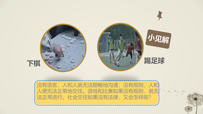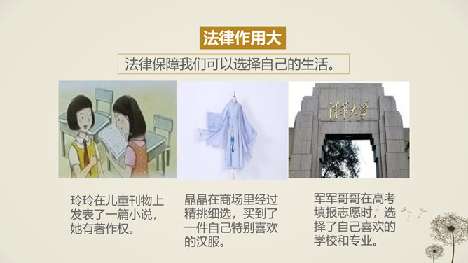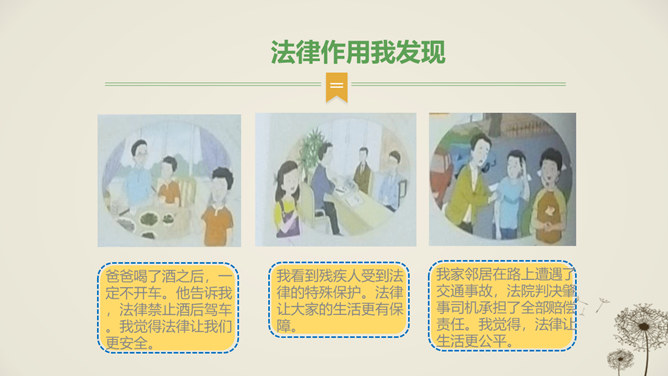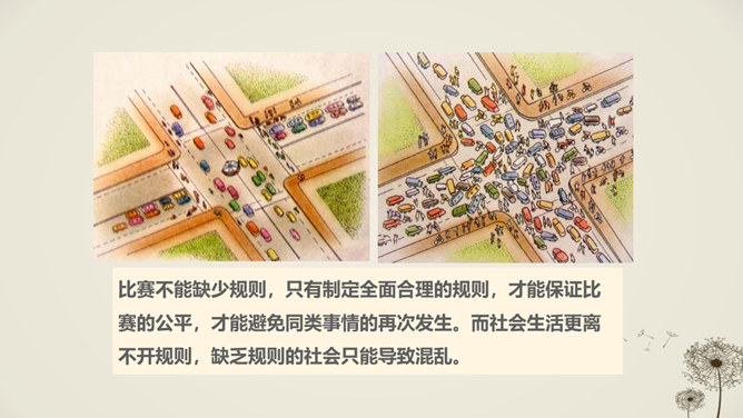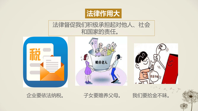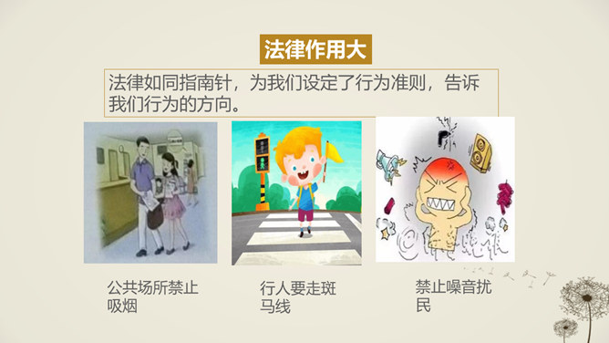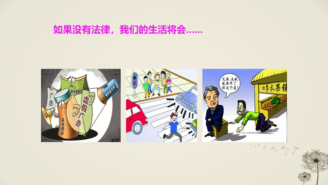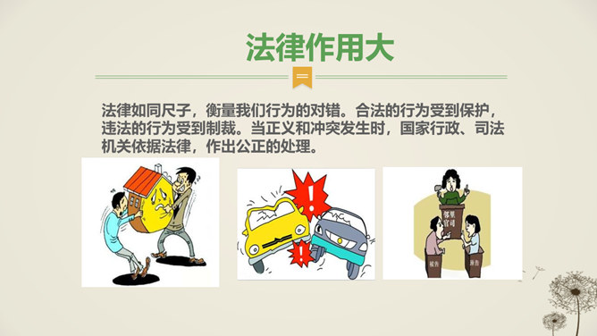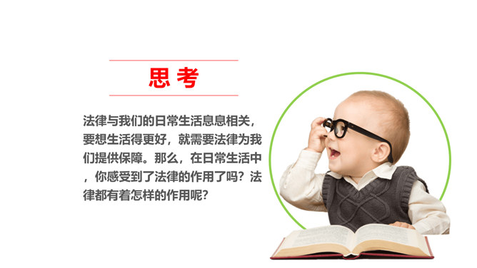 法律与我们的日常生活息息相关,要想生活得更好,就需要法律为我们提供保障。那么,在日常生活中,你感受到了法律的作用了吗?法律都有着怎样的作用呢?比赛不能缺少规则,只有制定全面合理的规则,才能保证比赛的公平,才能避免同类事情的再次发生。而社会生活更离不开规则,缺乏规则的社会只能导致混乱。没有语言,人和人就无法顺畅地沟通;没有规则,人和人便无法正常地交往。社会交往如果没有法律,又会怎样呢?所属专题:感受生活中的法律ppt。