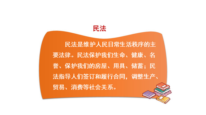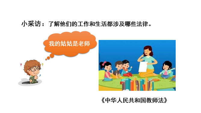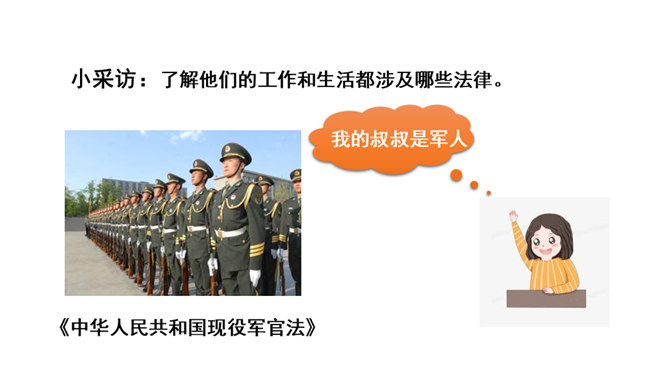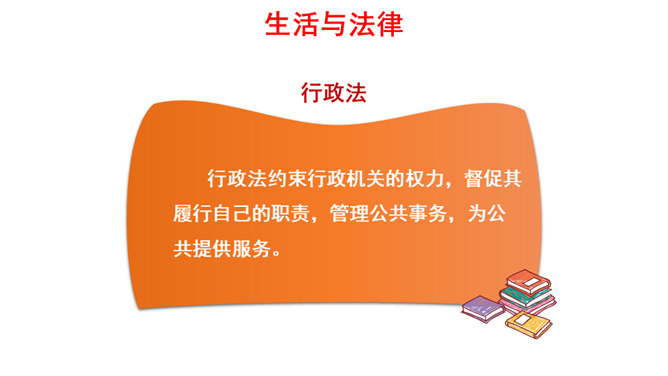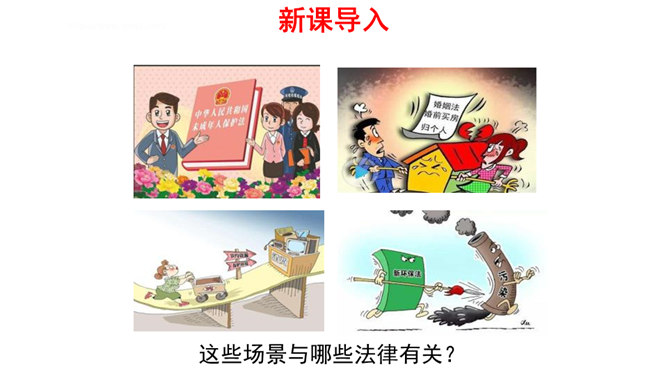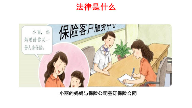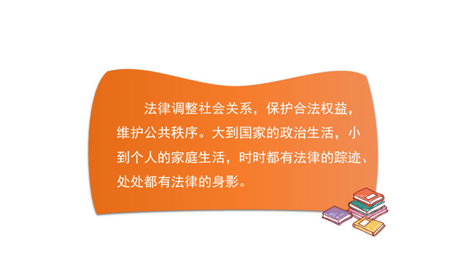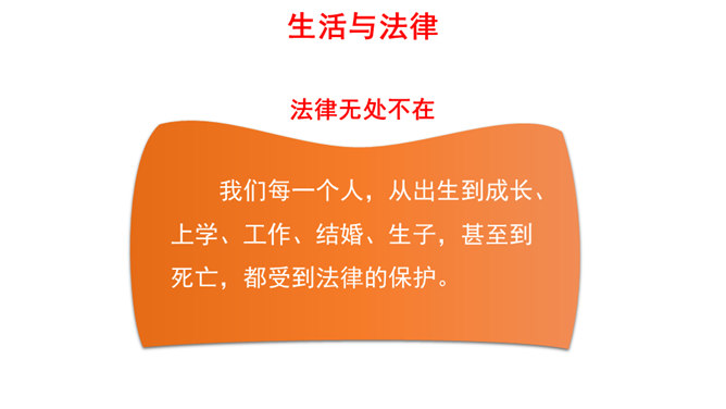 我们每一个人,从出生到成长、上学、工作、结婚、生子,甚至到死亡,都受到法律的保护。法律调整社会关系,保护合法权益,维护公共秩序。大到国家的政治生活,小到个人的家庭生活,时时都有法律的踪迹、处处都有法律的身影。(1)法律如同指南针,为我们设定了行为准则,告诉我们行为的方向。(2)法律保障我们可以选择自己的生活。(3)法律督促我们积极承担起对他人、社会和国家的责任。所属专题:感受生活中的法律ppt。