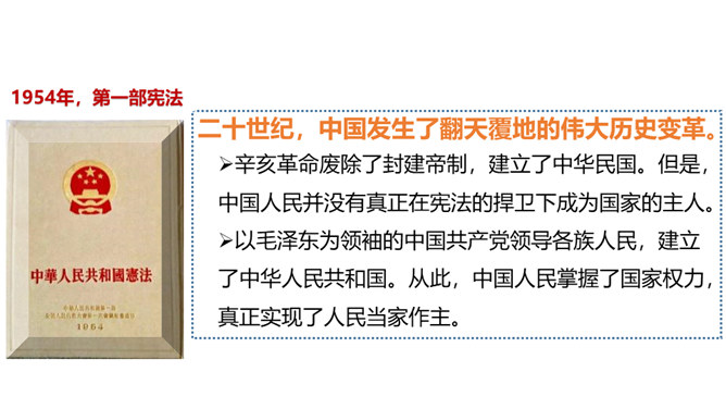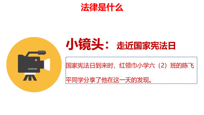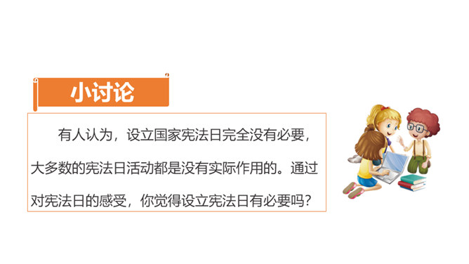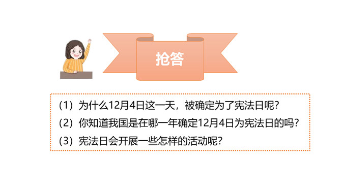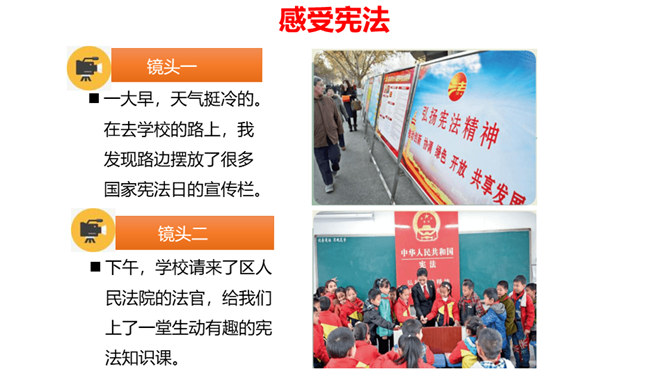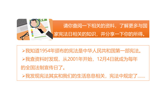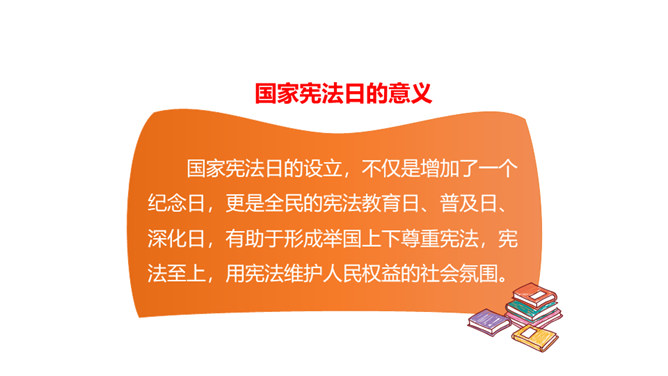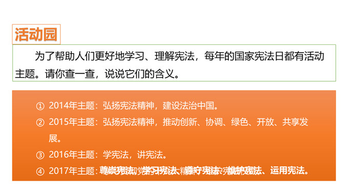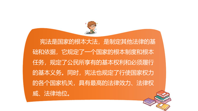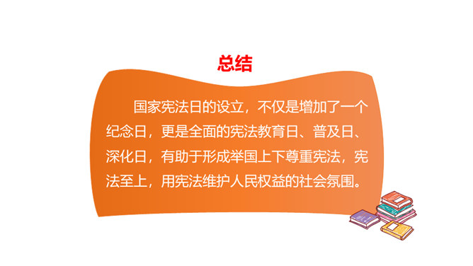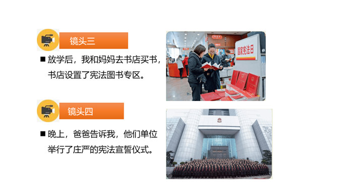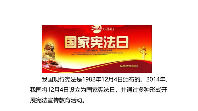 每个国家都十分重视本国的宪法,通过开展各式各样的宪法日活动,帮助人们树立宪法意识,从而形成崇尚宪法的良好社会氛围,维护宪法权威。而我们也更应该在日常生活中学习宪法、加强对宪法的了解和认识。国家宪法日,一年只有一天。但我们对宪法的认识,不能止于这一天。通过丰富多彩的宪法宣传教育活动,我们能够更好地学习宪法,了解宪法。在社会生活中,我们更要做到遵守宪法,维护宪法,保证宪法实施。所属专题:宪法是根本法ppt。