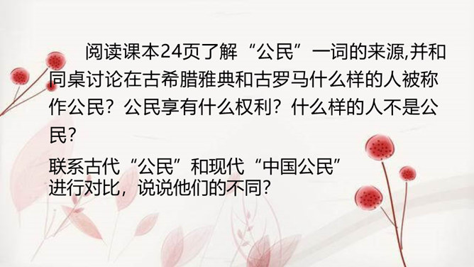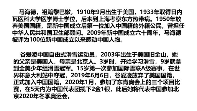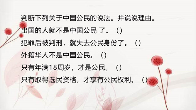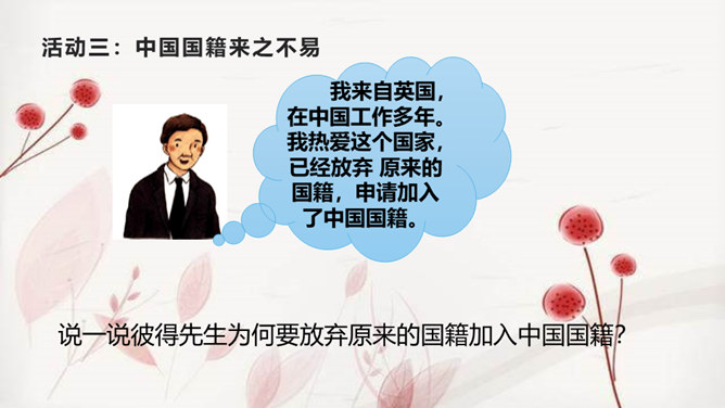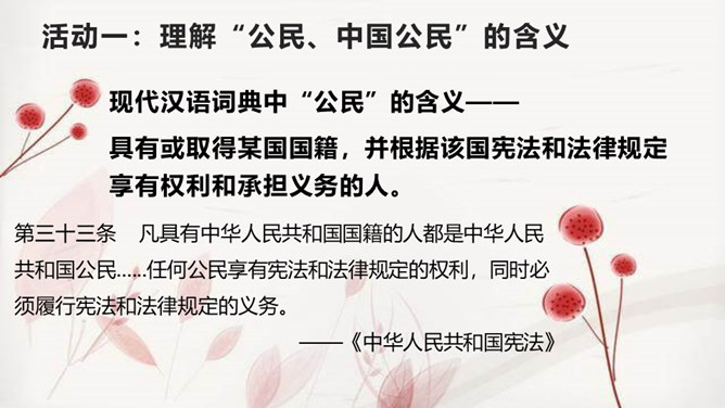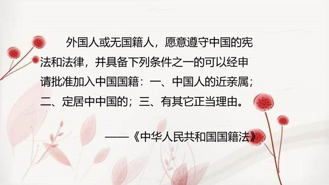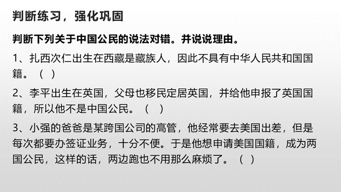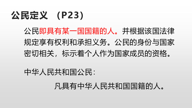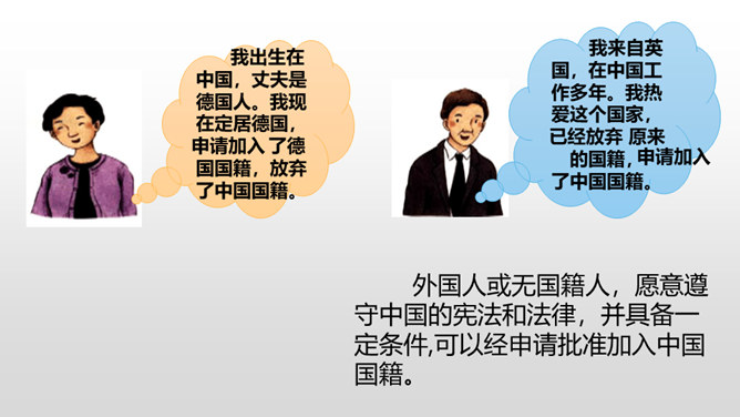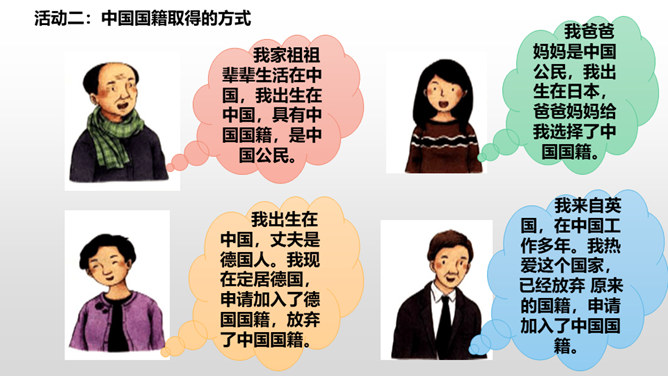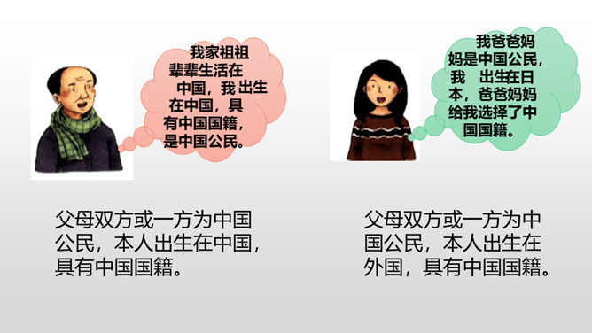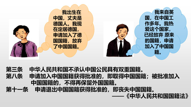 公民即具有某一国国籍的人。并根据该国法律规定享有权利和承担义务。公民的身份与国家密切相关,标示着个人作为国家成员的资格。我家祖祖辈辈生活在中国,我出生在中国,具有中国国籍,是中国公民。我爸爸妈妈是中国公民,我出生在日本,爸爸妈妈给我选择了中国国籍。我出生在中国,丈夫是德国人。我现在定居德国,申请加入了德国国籍,放弃了中国国籍。所属专题:公民意味着什么ppt。
