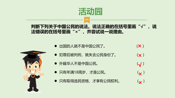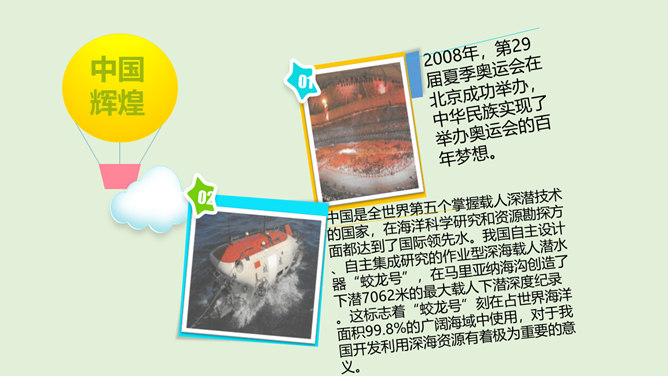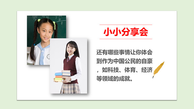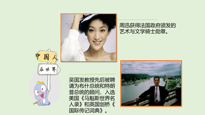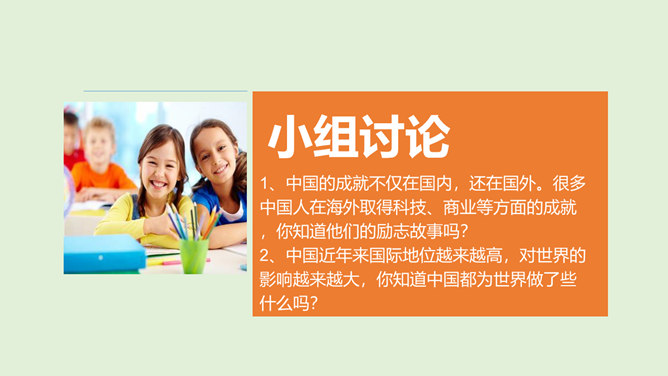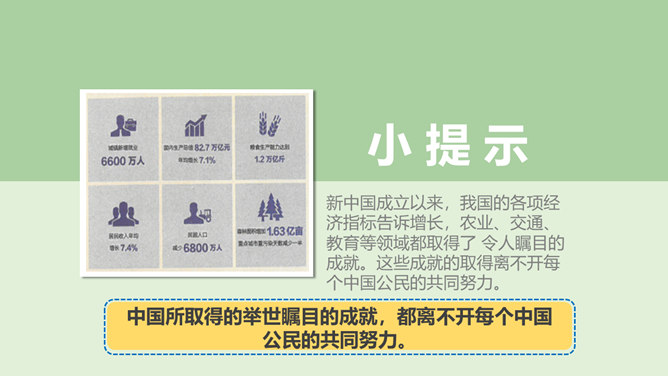 1、中国的成就不仅在国内,还在国外。很多中国人在海外取得科技、商业等方面的成就,你知道他们的励志故事吗?2、中国近年来国际地位越来越高,对世界的影响越来越大,你知道中国都为世界做了些什么吗?新中国成立以来,我国的各项经济指标告诉增长,农业、交通、教育等领域都取得了 令人瞩目的成就。这些成就的取得离不开每个中国公民的共同努力。所属专题:公民意味着什么ppt。