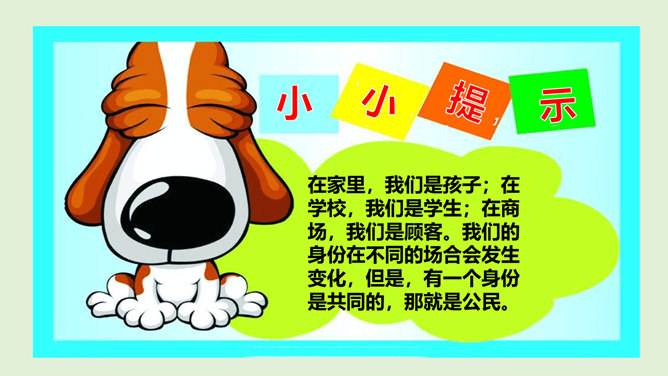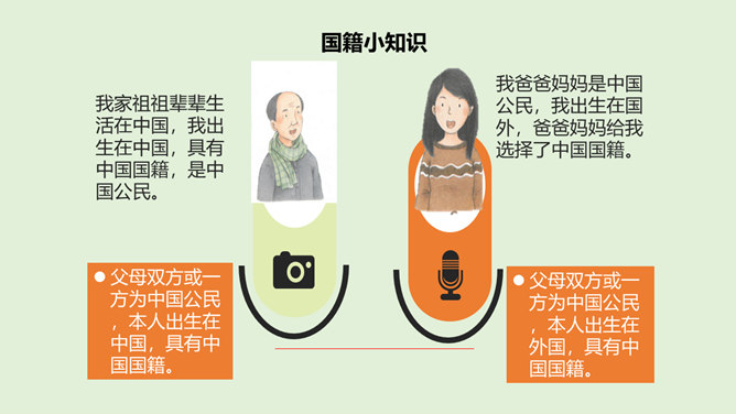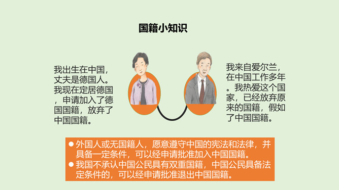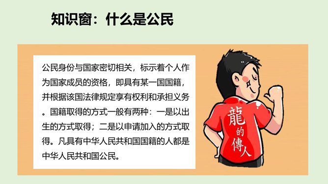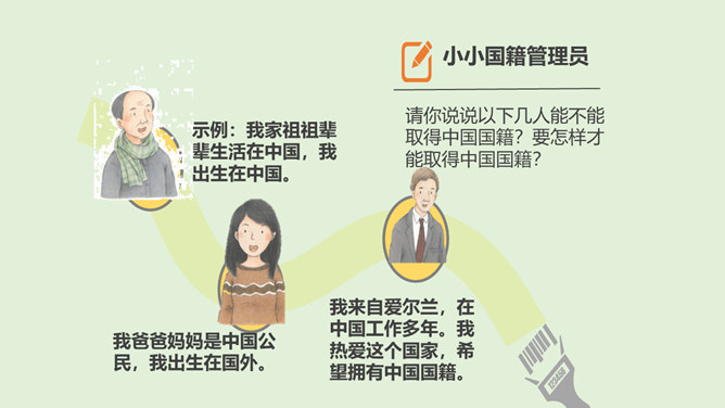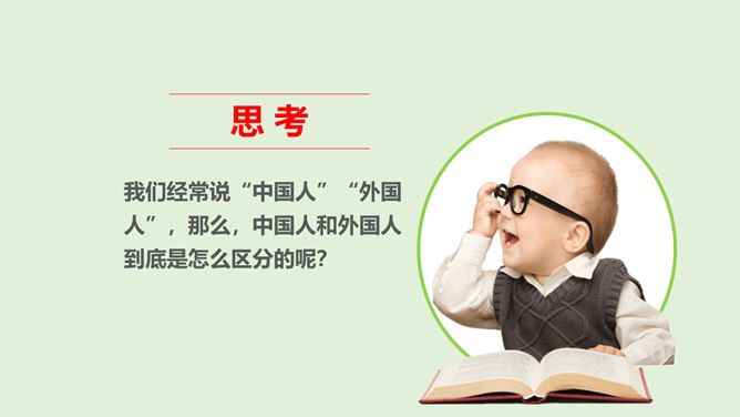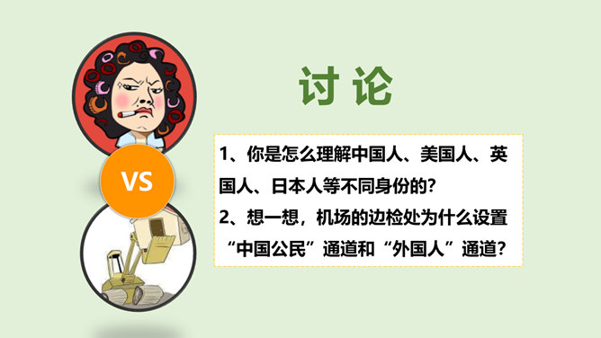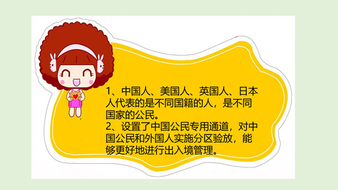 我们经常说“中国人”“外国人”,那么,中国人和外国人到底是怎么区分的呢?讨论:1、你是怎么理解中国人、美国人、英国人、日本人等不同身份的?2、想一想,机场的边检处为什么设置“中国公民”通道和“外国人”通道?1、中国人、美国人、英国人、日本人代表的是不同国籍的人,是不同国家的公民。2、设置了中国公民专用通道,对中国公民和外国人实施分区验放,能够更好地进行出入境管理。所属专题:公民意味着什么ppt。