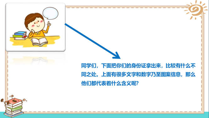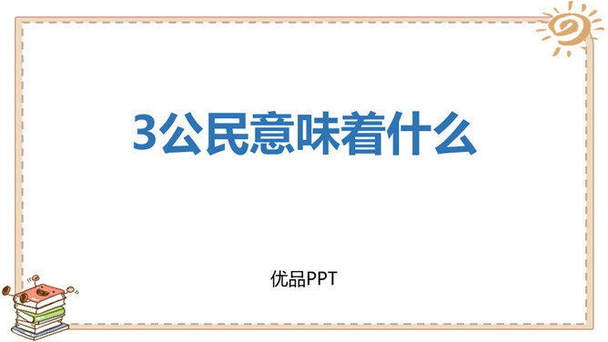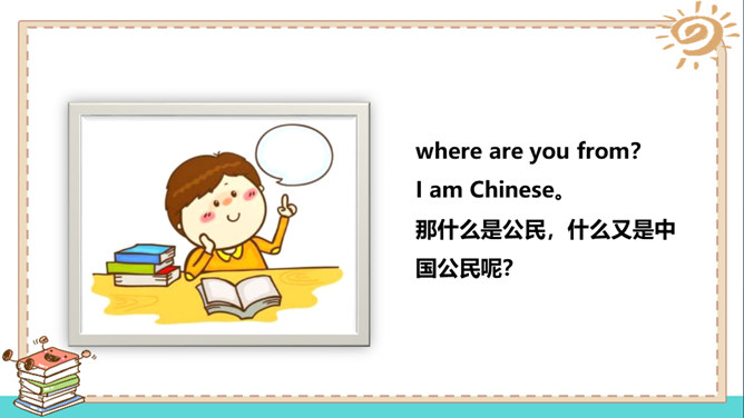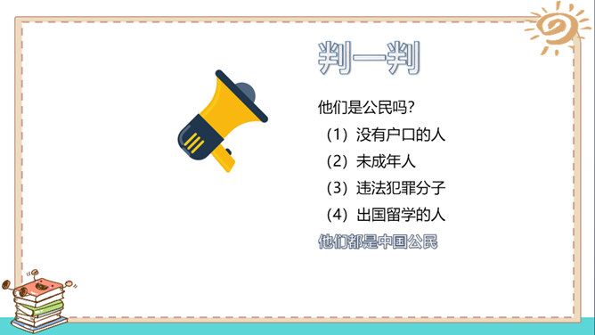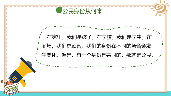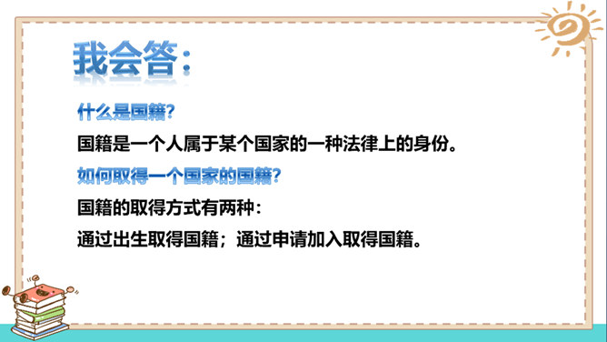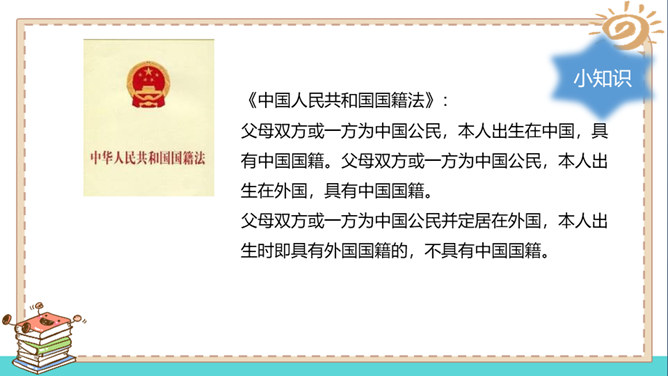 在家里,我们是孩子;在学校,我们是学生;在商场,我们是顾客。我们的身份在不同的场合会发生变化,但是,有一个身份是共同的,那就是公民。说一说:我们在不同的时间不同的场合都有自己特定的身份,请同学能举举例子。什么是国籍?国籍是一个人属于某个国家的一种法律上的身份。如何取得一个国家的国籍?国籍的取得方式有两种:通过出生取得国籍;通过申请加入取得国籍。所属专题:公民意味着什么ppt。
