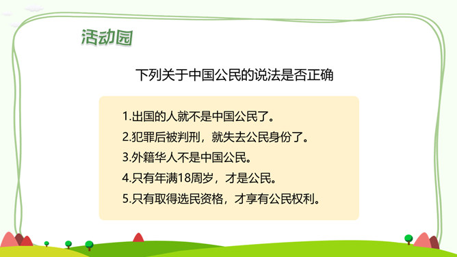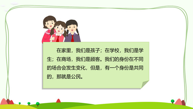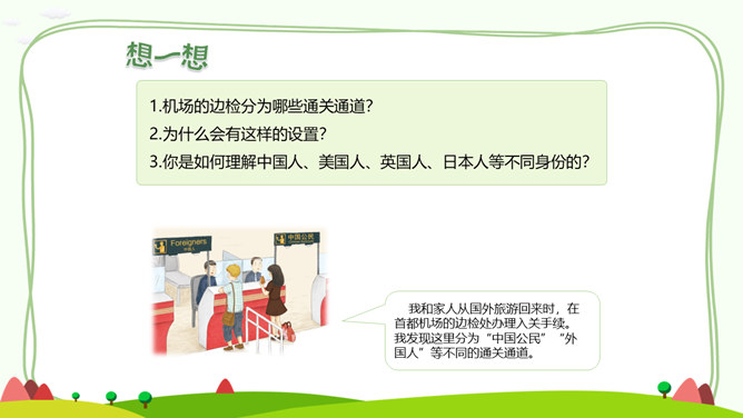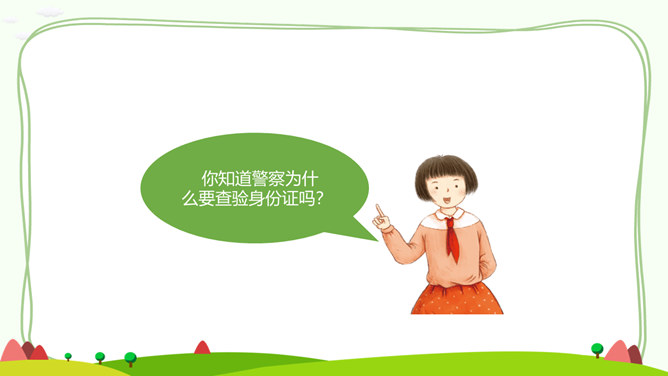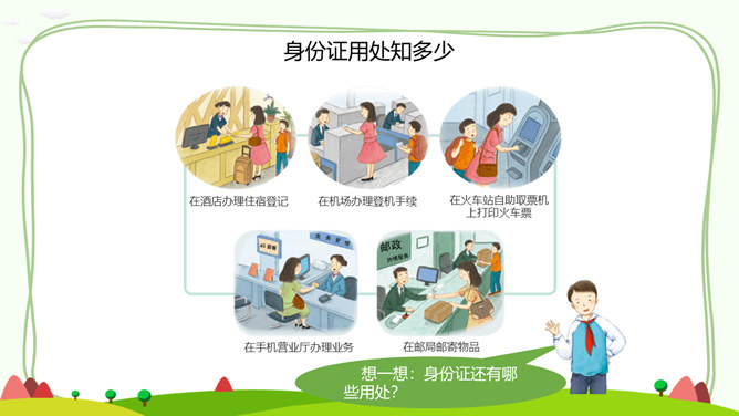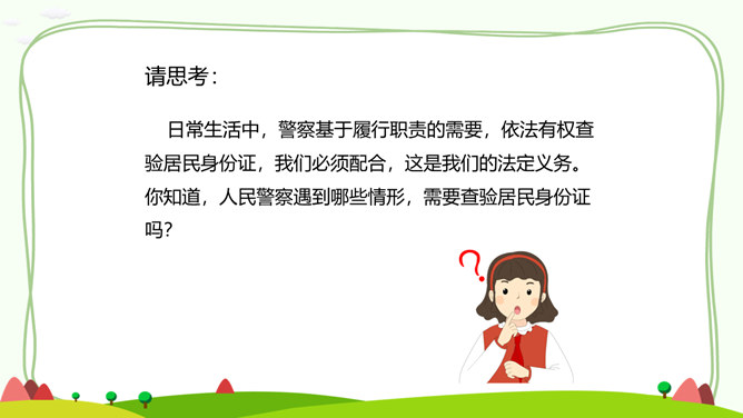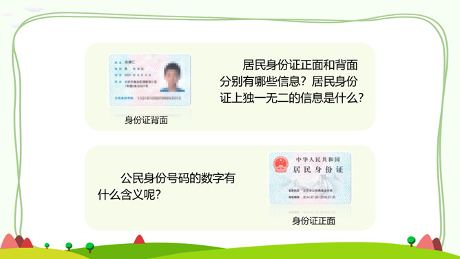 居民身份证正面和背面分别有哪些信息?居民身份证上独一无二的信息是什么?公民身份号码的数字有什么含义呢?你知道警察为什么要查验身份证吗?请思考:日常生活中,警察基于履行职责的需要,依法有权查验居民身份证,我们必须配合,这是我们的法定义务。你知道,人民警察遇到哪些情形,需要查验居民身份证吗?走出国门,每个人都代表中国,都是中国的名片。所属专题:公民意味着什么ppt。