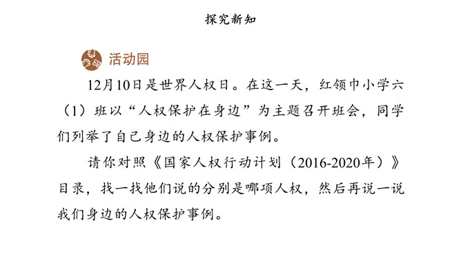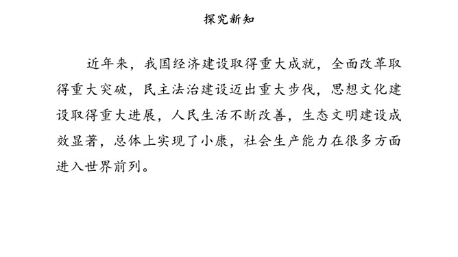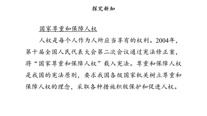 人权是每个人作为人所应当享有的权利。2004年,第十届全国人民代表大会第二次会议通过宪法修正案,将“国家尊重和保障人权”载入宪法。尊重和保障人权是我国的宪法原则,要求我国各级国家机关树立尊重和保障人权的理念,采取各种措施积极保护和促进人权。近年来,我国经济建设取得重大成就,全面改革取得重大突破,民主法治建设迈出重大步伐,思想文化建设取得重大进展,人民生活不断改善,生态文明建设成效显著,总体上实现了小康,社会生产能力在很多方面进入世界前列。所属专题:公民的基本权利和义务ppt。