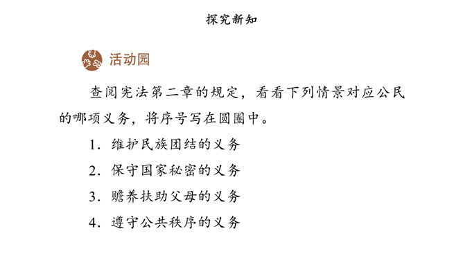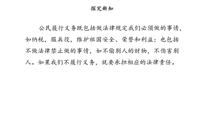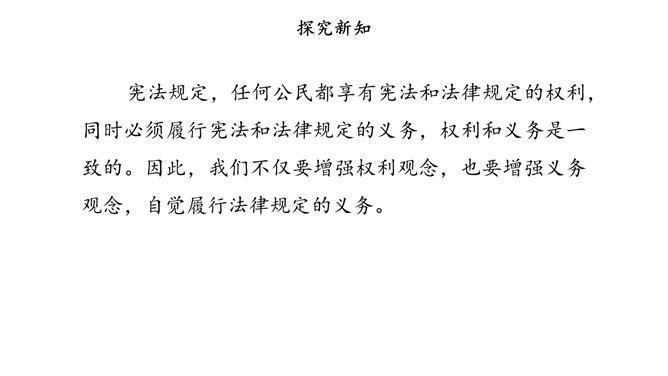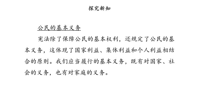 宪法除了保障公民的基本权利,还规定了公民的基本义务,这体现了国家利益、集体利益和个人利益相结合的原则。我们应当履行的基本义务,既有对国家、社会的义务,也有对家庭的义务。宪法规定,任何公民都享有宪法和法律规定的权利,同时必须履行宪法和法律规定的义务,权利和义务是一致的。因此,我们不仅要增强权利观念,也要增强义务观念,自觉履行法律规定的义务。公民履行义务既包括做法律规定我们必须做的事情,如纳税,服兵役,维护祖国安全、荣誉和利益。所属专题:公民的基本权利和义务ppt。