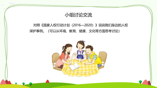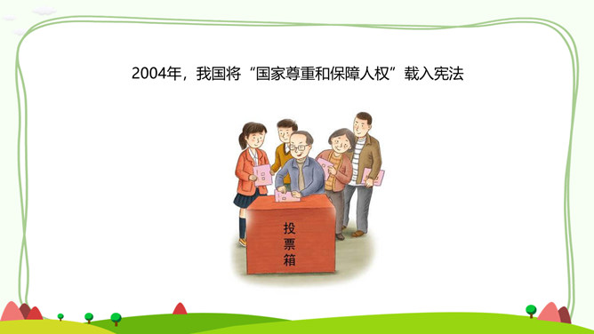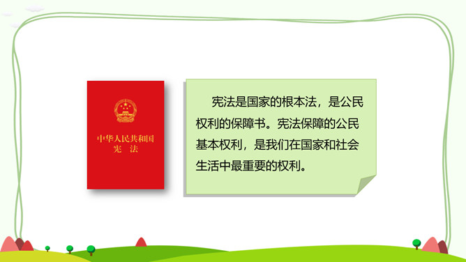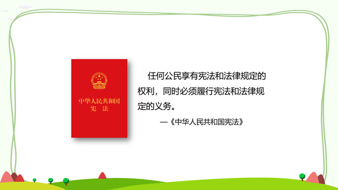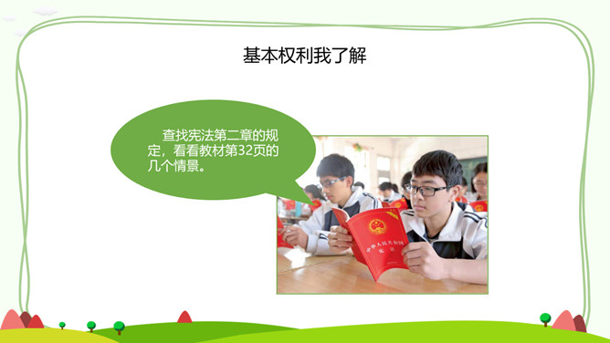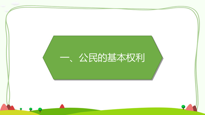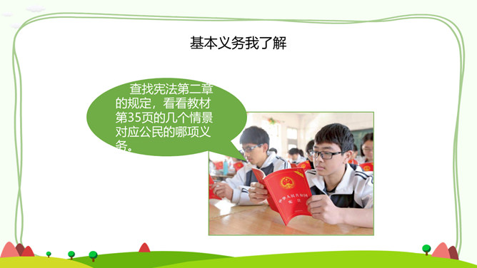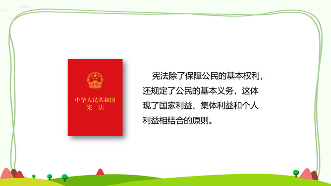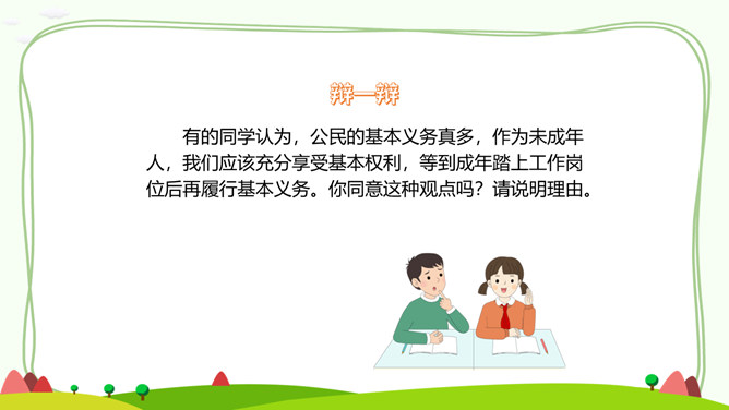 一、公民的基本权利。宪法是国家的根本法,是公民权利的保障书。宪法保障的公民基本权利,是我们在国家和社会生活中最重要的权利。二、公民的基本义务。宪法除了保障公民的基本权利,还规定了公民的基本义务,这体现了国家利益、集体利益和个人利益相结合的原则。有的同学认为,公民的基本义务真多,作为未成年人,我们应该充分享受基本权利,等到成年踏上工作岗位后再履行基本义务。你同意这种观点吗?请说明理由。任何公民享有宪法和法律规定的权利,同时必须履行宪法和法律规定的义务。所属专题:公民的基本权利和义务ppt。
