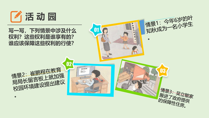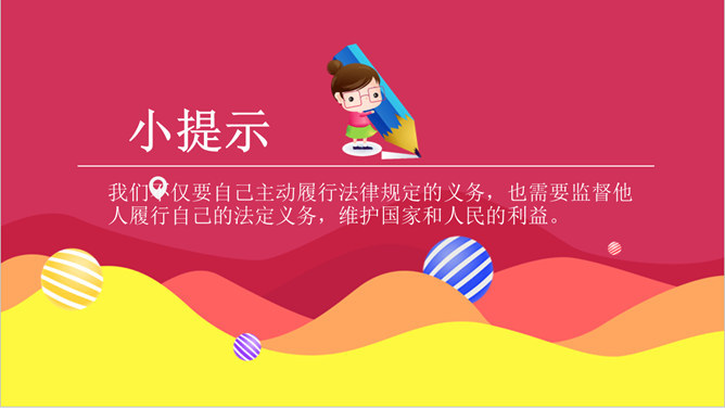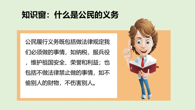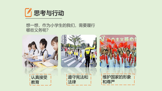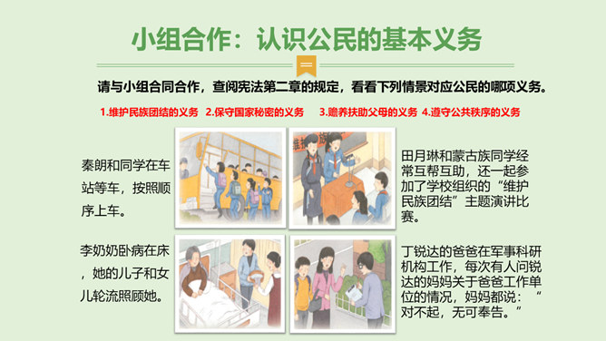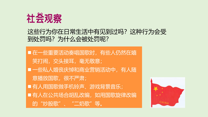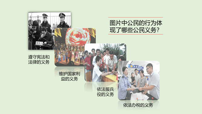 这些行为你在日常生活中有见到过吗?这种行为会受到处罚吗?为什么会被处罚呢?在一些重要活动奏唱国歌时,有些人仍然在嬉笑打闹,交头接耳,毫无敬意;一些私人婚丧庆悼和商业营销活动中,有人随意播放国歌,很不严肃。公民履行义务既包括做法律规定我们必须做的事情,如纳税,服兵役,维护祖国安全、荣誉和利益;也包括不做法律禁止做的事情,如不偷别人的财物,不伤害别人。我们不仅要自己主动履行法律规定的义务,也需要监督他人履行自己的法定义务,维护国家和人民的利益。所属专题:公民的基本权利和义务ppt。
