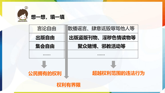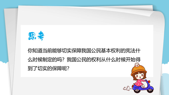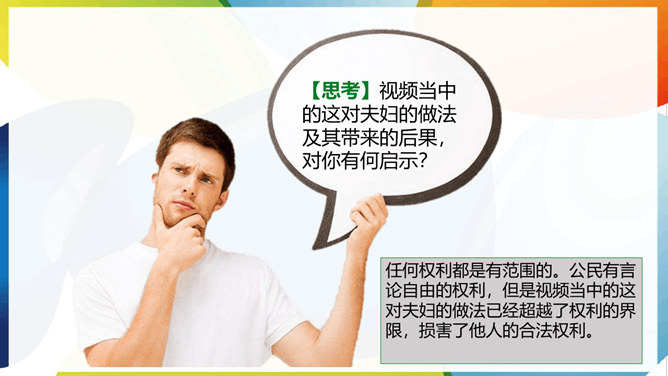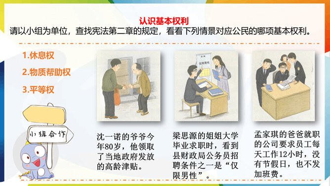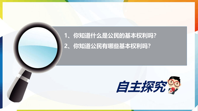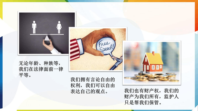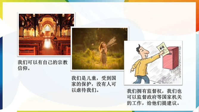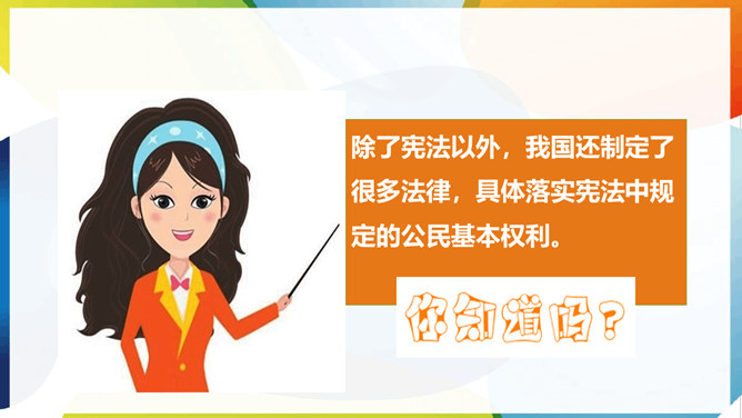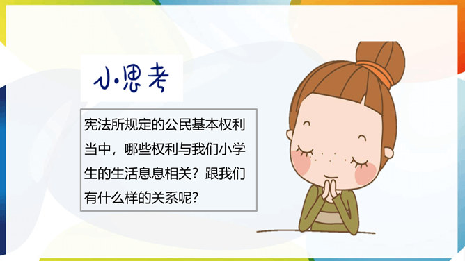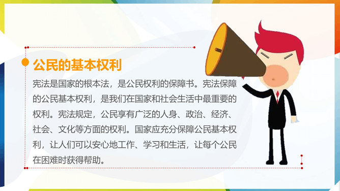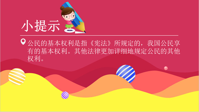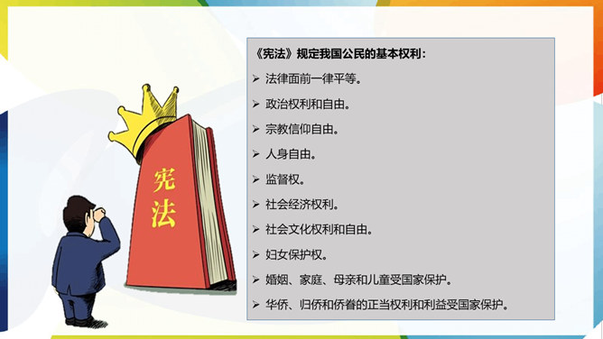 宪法所规定的公民基本权利当中,哪些权利与我们小学生的生活息息相关?跟我们有什么样的关系呢?无论年龄、种族等,我们在法律面前一律平等。我们拥有言论自由的权利,我们可以自由表达自己的观点。宪法是国家的根本法,是公民权利的保障书。宪法保障的公民基本权利,是我们在国家和社会生活中最重要的权利。宪法规定,公民享有广泛的人身、政治、经济、社会、文化等方面的权利。国家应充分保障公民基本权利,让人们可以安心地工作、学习和生活,让每个公民在困难时获得帮助。所属专题:公民的基本权利和义务ppt。