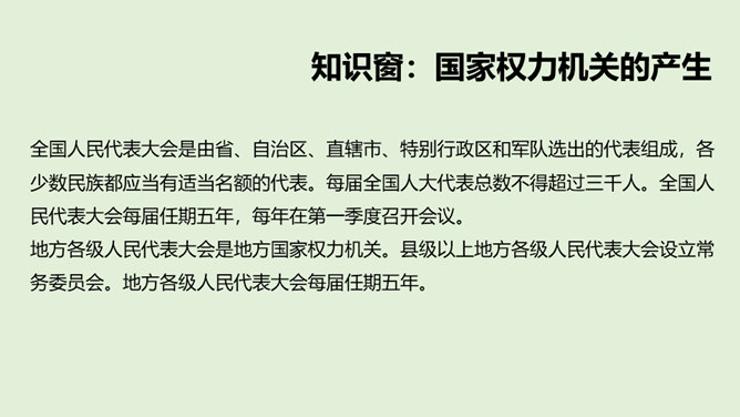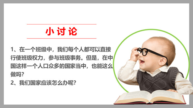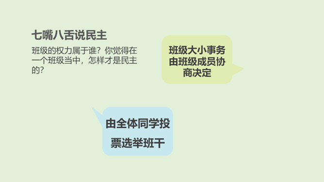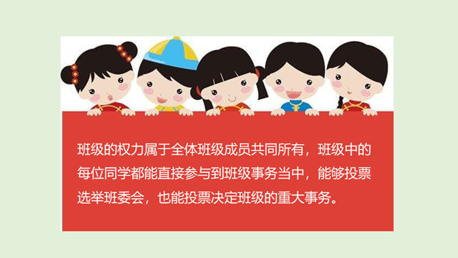 班级的权力属于谁?你觉得在一个班级当中,怎样才是民主的?班级大小事务由班级成员协商决定。班级的权力属于全体班级成员共同所有,班级中的每位同学都能直接参与到班级事务当中,能够投票选举班委会,也能投票决定班级的重大事务。在一个班级中,我们每个人都可以直接行使班级权力,参与班级事务。但是,在中国这样一个人口众多的国家当中,也能这么做吗?我国人口众多,不可能每个人都直接行使国家权力。人民通过选举产生人大代表,组成人民代表大会,代表人民行使国家权力,对人民负责,受人民监督。所属专题:国家机构有哪些ppt。
