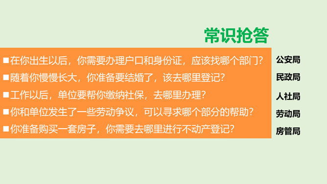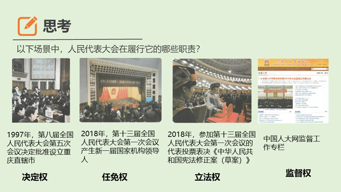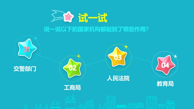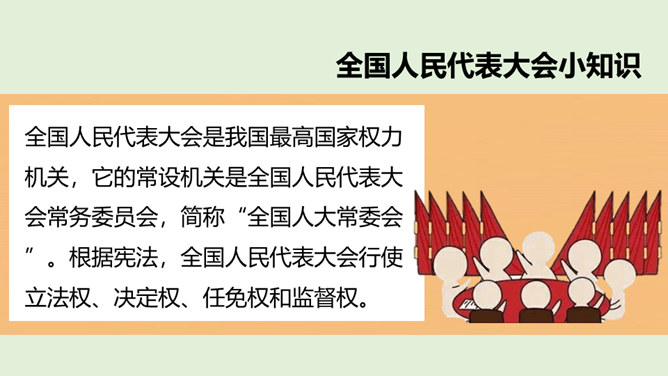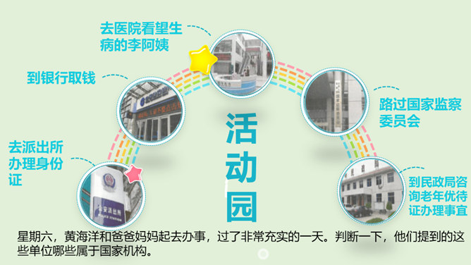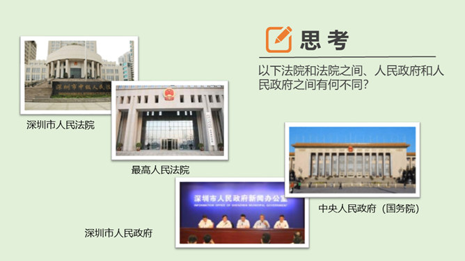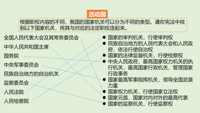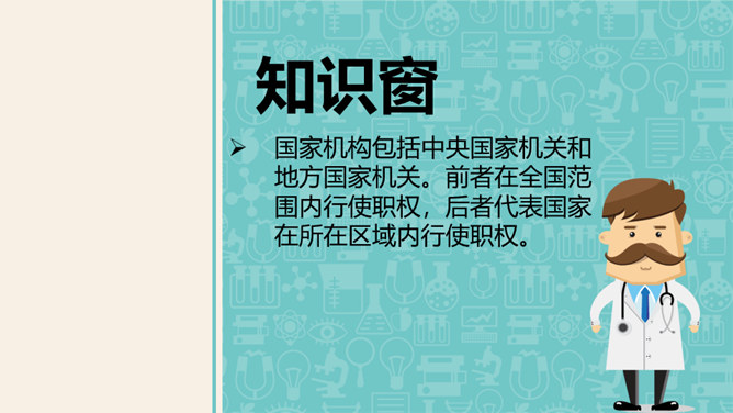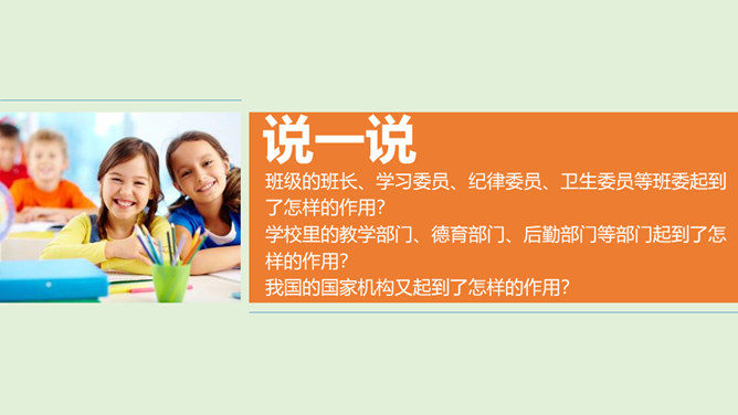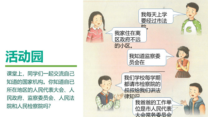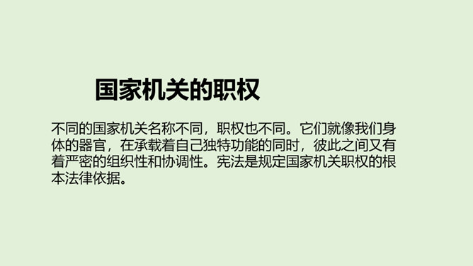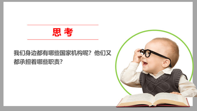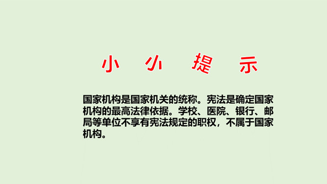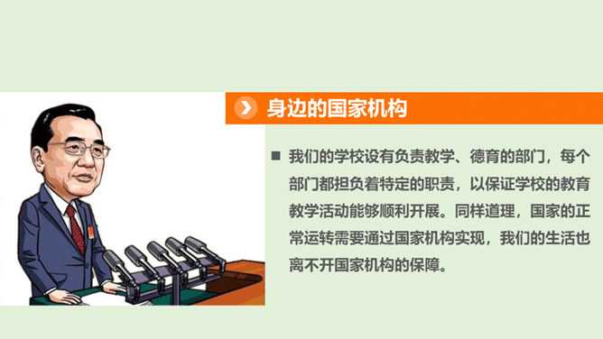我们身边都有哪些国家机构呢?他们又都承担着哪些职责?班级的班长、学习委员、纪律委员、卫生委员等班委起到了怎样的作用?学校里的教学部门、德育部门、后勤部门等部门起到了怎样的作用?我国的国家机构又起到了怎样的作用?我们的学校设有负责教学、德育的部门,每个部门都担负着特定的职责,以保证学校的教育教学活动能够顺利开展。同样道理,国家的正常运转需要通过国家机构实现,我们的生活也离不开国家机构的保障。国家机构是国家机关的统称。宪法是确定国家机构的最高法律依据。所属专题:国家机构有哪些ppt。