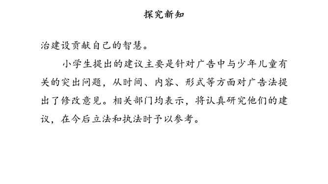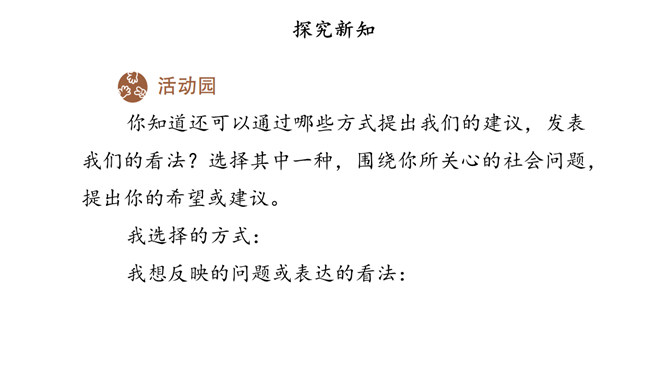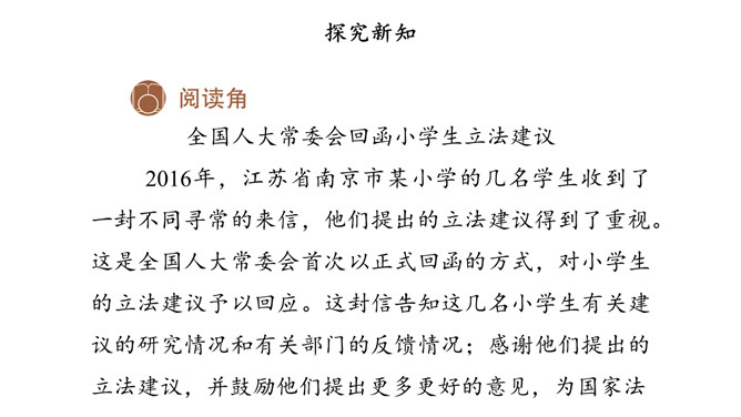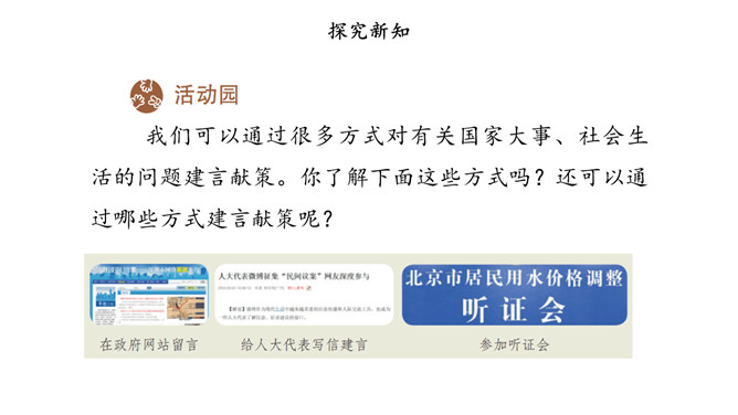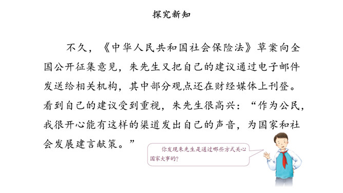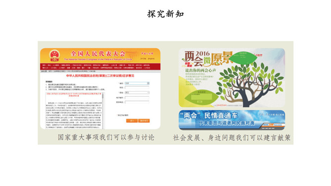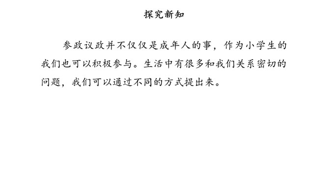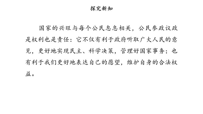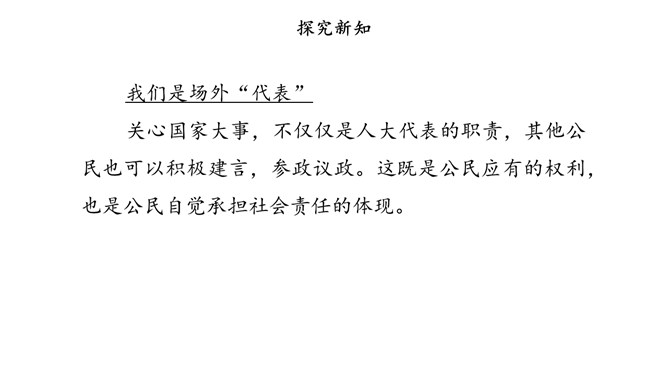 关心国家大事,不仅仅是人大代表的职责,其他公民也可以积极建言,参政议政。这既是公民应有的权利,也是公民自觉承担社会责任的体现。国家的兴旺与每个公民息息相关,公民参政议政是权利也是责任:它不仅有利于政府听取广大人民的意见,更好地实现民主、科学决策,管理好国家事务;也有利于我们更好地表达自己的愿望,维护自身的合法权益。参政议政并不仅仅是成年人的事,作为小学生的我们也可以积极参与。生活中有很多和我们关系密切的问题,我们可以通过不同的方式提出来。所属专题:人大代表为人民ppt。