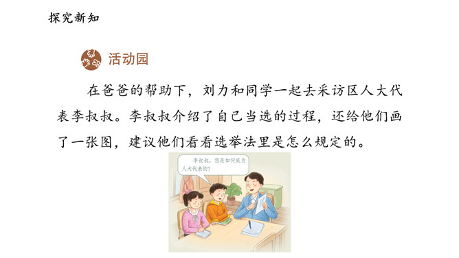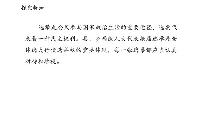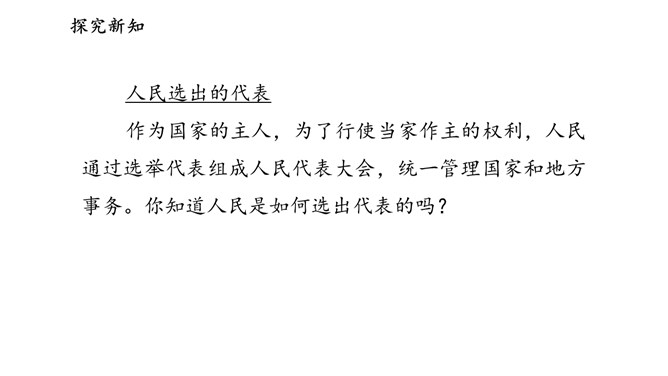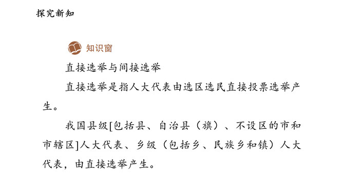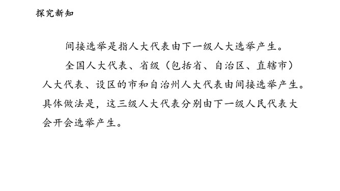 作为国家的主人,为了行使当家作主的权利,人民通过选举代表组成人民代表大会,统一管理国家和地方事务。你知道人民是如何选出代表的吗?直接选举是指人大代表由选区选民直接投票选举产生。我国县级[包括县、自治县(旗)、不设区的市和市辖区]人大代表、乡级(包括乡、民族乡和镇)人大代表,由直接选举产生。间接选举是指人大代表由下一级人大选举产生。全国人大代表、省级(包括省、自治区、直辖市)人大代表、设区的市和自治州人大代表由间接选举产生。所属专题:人大代表为人民ppt。