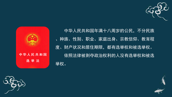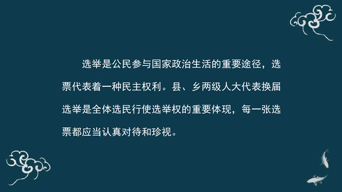 选举是公民参与国家政治生活的重要途径,选票代表着一种民主权利。县、乡两级人大代表换届选举是全体选民行使选举权的重要体现,每一张选票都应当认真对待和珍视。 中华人民共和国年满十八周岁的公民,不分民族、种族、性别、职业、家庭出身、宗教信仰、教育程度、财产状况和居住期限,都有选举权和被选举权。依照法律被剥夺政治权利的人没有选举权和被选举权。作为人大代表,就是要积极履行代表职责,充分掌握民情,广泛集中民智,准确反映民意,努力做到权为民所用、利为民所谋、情为民所系。所属专题:人大代表为人民ppt。