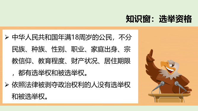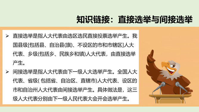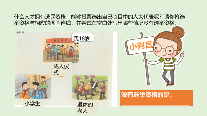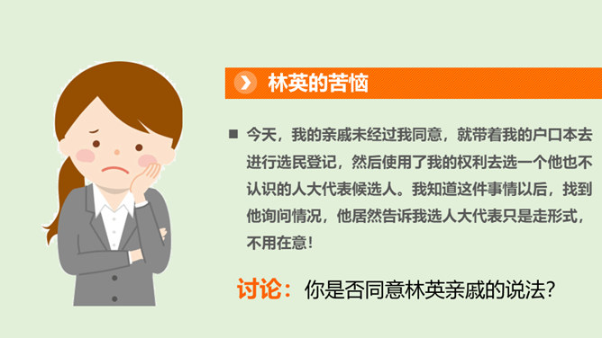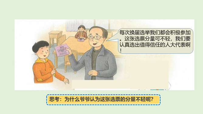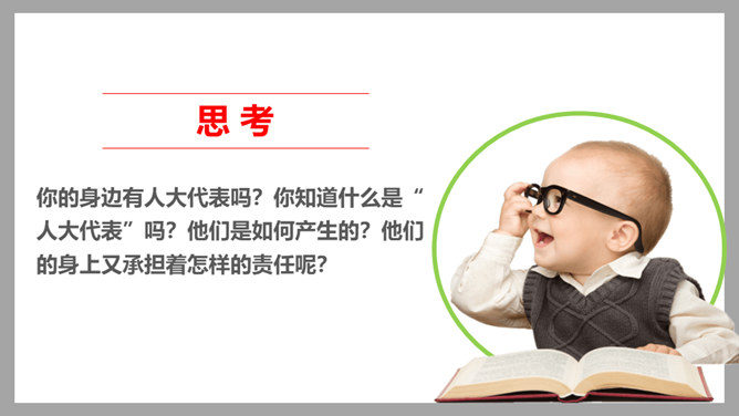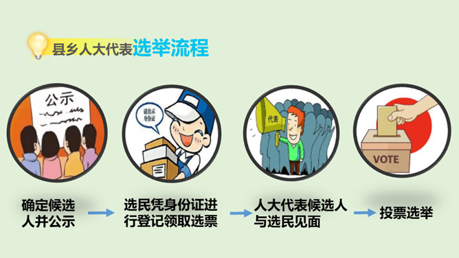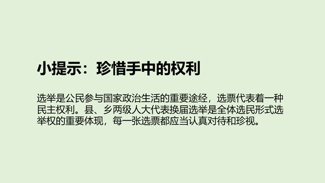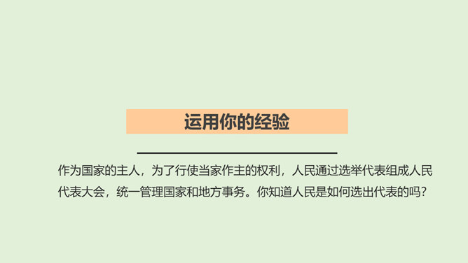 你的身边有人大代表吗?你知道什么是“人大代表”吗?他们是如何产生的?他们的身上又承担着怎样的责任呢?作为国家的主人,为了行使当家作主的权利,人民通过选举代表组成人民代表大会,统一管理国家和地方事务。你知道人民是如何选出代表的吗?选举是公民参与国家政治生活的重要途经,选票代表着一种民主权利。县、乡两级人大代表换届选举是全体选民形式选举权的重要体现,每一张选票都应当认真对待和珍视。什么人才拥有选民资格,能够投票选出自己心目中的人大代表呢?所属专题:人大代表为人民ppt。