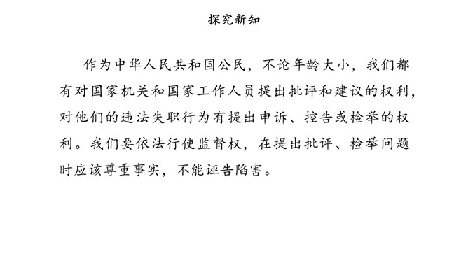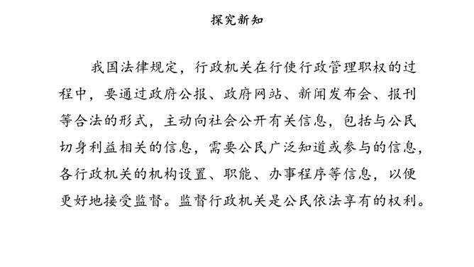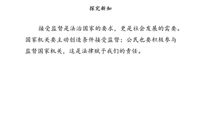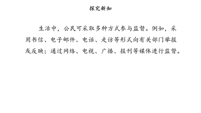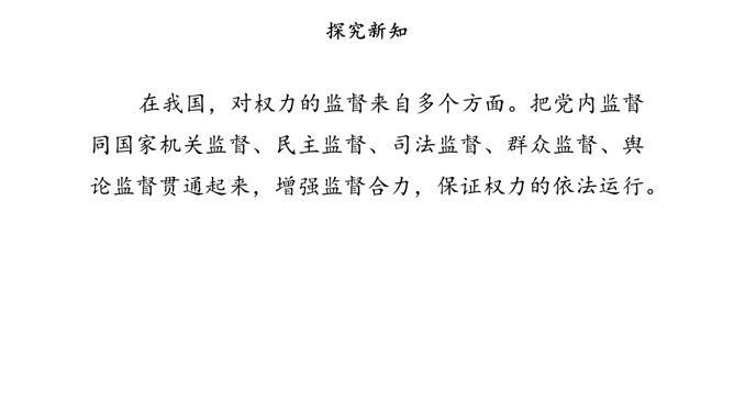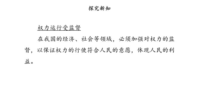 在我国的经济、社会等领域,必须加强对权力的监督,以保证权力的行使符合人民的意愿,体现人民的利益。国家机关及其工作人员必须按照法律要求,保持同公民与社会的联系,倾听意见,接受监督,保证国家机关依法行使权力,自觉履行职责。在我国,对权力的监督来自多个方面。把党内监督同国家机关监督、民主监督、司法监督、群众监督、舆论监督贯通起来,增强监督合力,保证权力的依法运行。生活中,公民可采取多种方式参与监督。例如,采用书信、电子邮件、电话、走访等形式向有关部门举报或反映。所属专题:权力受到制约和监督ppt。