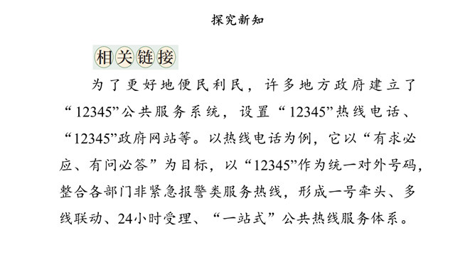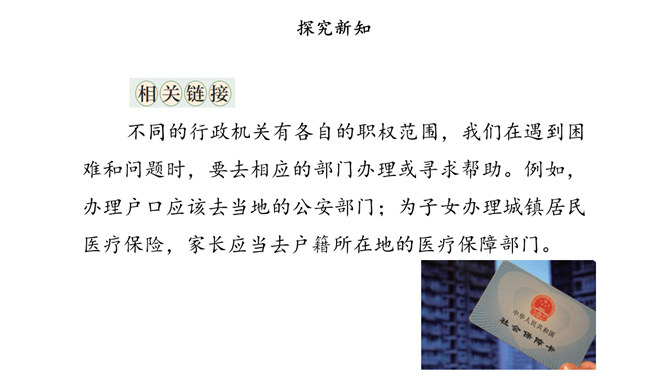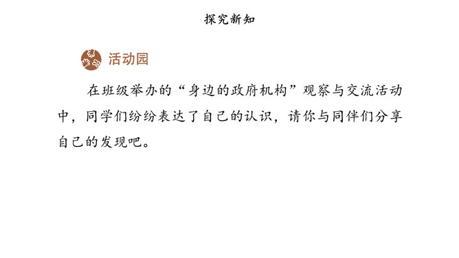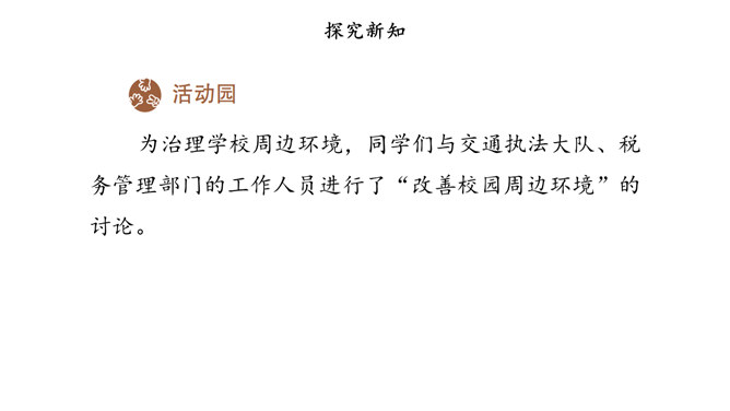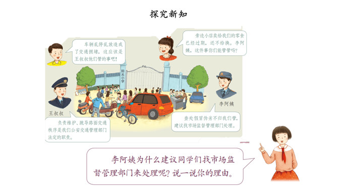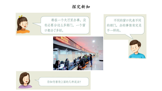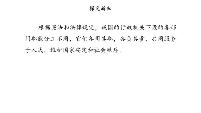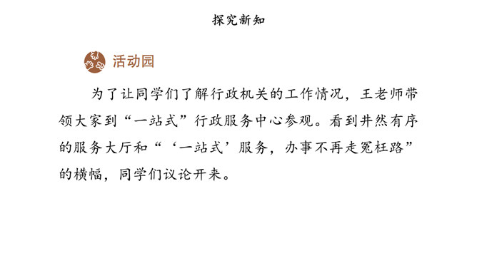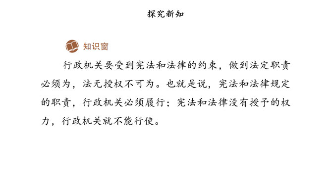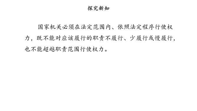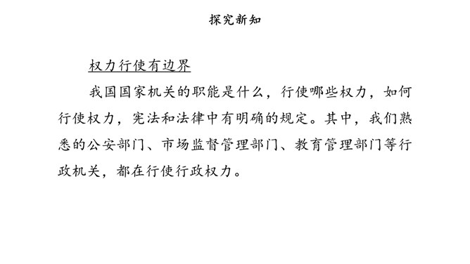 我国国家机关的职能是什么,行使哪些权力,如何行使权力,宪法和法律中有明确的规定。其中,我们熟悉的公安部门、市场监督管理部门、教育管理部门等行政机关,都在行使行政权力。为治理学校周边环境,同学们与交通执法大队、税务管理部门的工作人员进行了“改善校园周边环境”的讨论。行政机关要受到宪法和法律的约束,做到法定职责必须为,法无授权不可为。也就是说,宪法和法律规定的职责,行政机关必须履行;宪法和法律没有授予的权力,行政机关就不能行使。所属专题:权力受到制约和监督ppt。