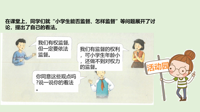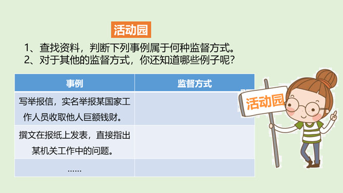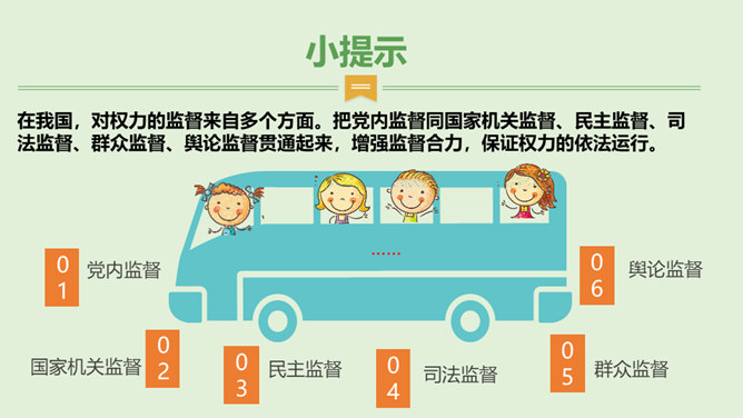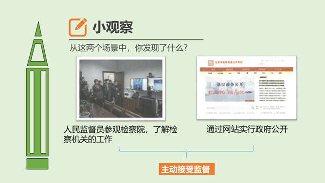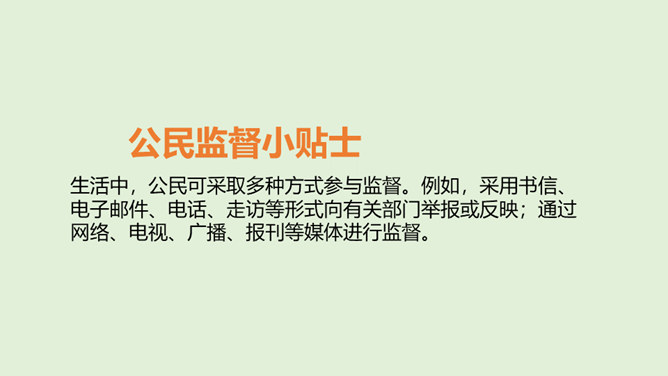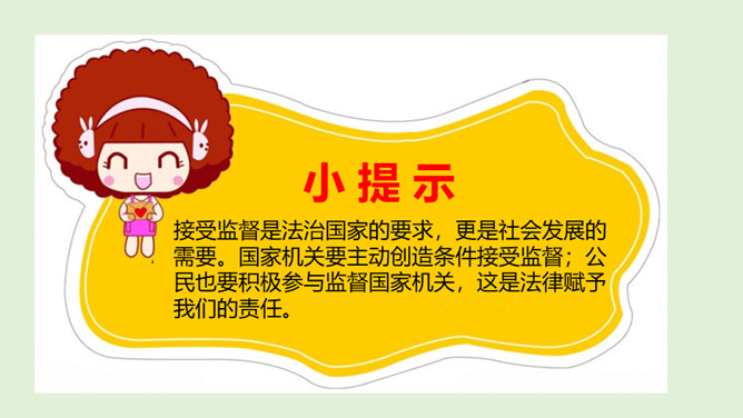 国家机关及其工作人员必须按照法律要求,保持同公民与社会的练习,倾听意见,接受监督,保证国家机关依法行使权力,自觉履行职责。怎样才能保证国家机关及其工作人员按照法律要求行使权力呢?1、想一想,说一说不受监督的权力会怎样?2、怎样才能监督好权力?谁来监督呢?在我国,对权力的监督来自多个方面。把党内监督同国家机关监督、民主监督、司法监督、群众监督、舆论监督贯通起来,增强监督合力,保证权力的依法运行。接受监督是法治国家的要求,更是社会发展的需要。所属专题:权力受到制约和监督ppt。