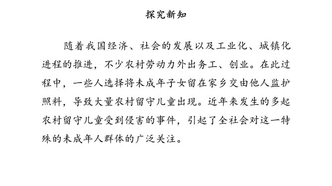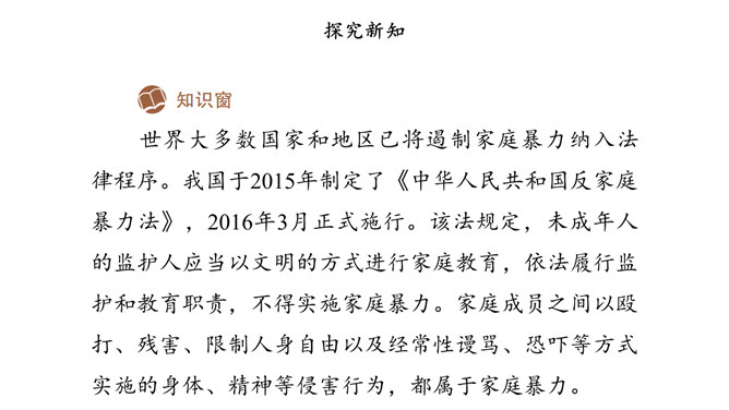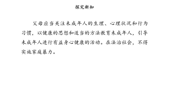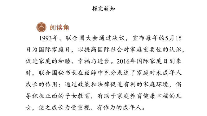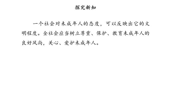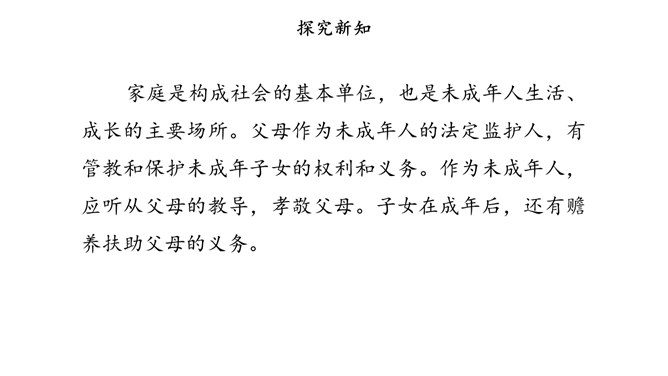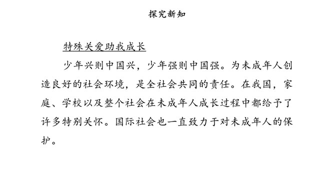 少年兴则中国兴,少年强则中国强。为未成年人创造良好的社会环境,是全社会共同的责任。在我国,家庭、学校以及整个社会在未成年人成长过程中都给予了许多特别关怀。国际社会也一直致力于对未成年人的保护。家庭是构成社会的基本单位,也是未成年人生活、成长的主要场所。父母作为未成年人的法定监护人,有管教和保护未成年子女的权利和义务。作为未成年人,应听从父母的教导,孝敬父母。子女在成年后,还有赡养扶助父母的义务。父母应当关注未成年人的生理、心理状况和行为习惯。所属专题:我们受特殊保护ppt。