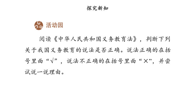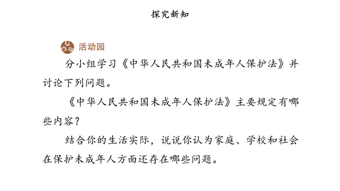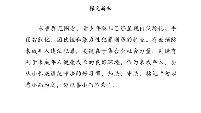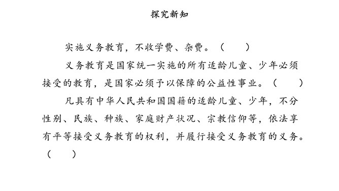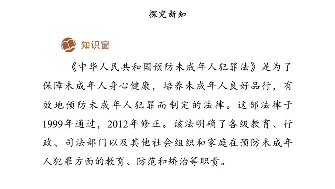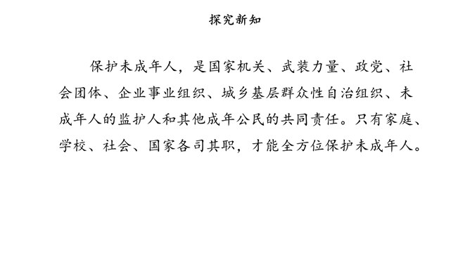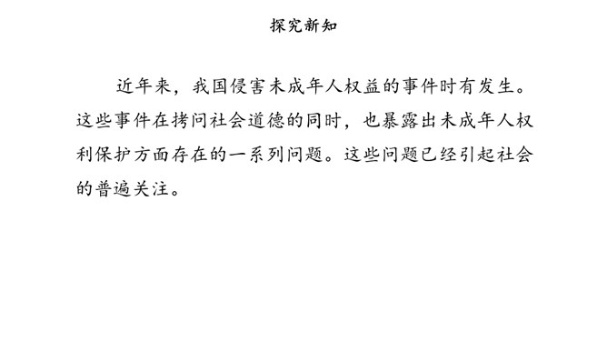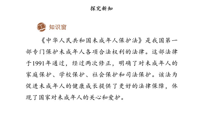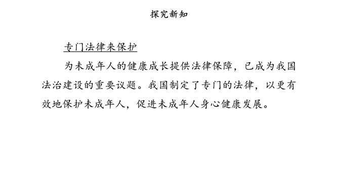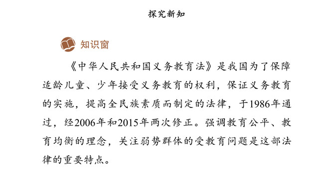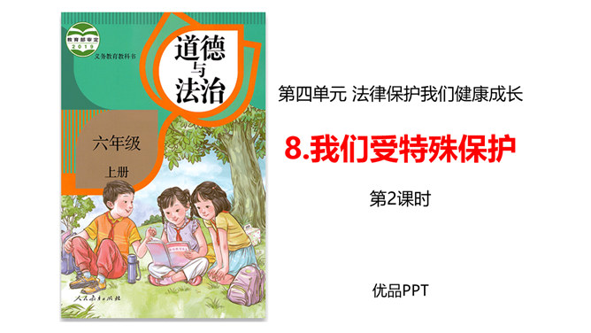 为未成年人的健康成长提供法律保障,已成为我国法治建设的重要议题。我国制定了专门的法律,以更有效地保护未成年人,促进未成年人身心健康发展。义务教育关乎中国教育事业的发展。全面提高义务教育质量,不仅有助于促进教育公平,而且对全民族素质的提高和民族的复兴具有重要意义。近年来,我国侵害未成年人权益的事件时有发生。这些事件在拷问社会道德的同时,也暴露出未成年人权利保护方面存在的一系列问题。这些问题已经引起社会的普遍关注。所属专题:我们受特殊保护ppt。