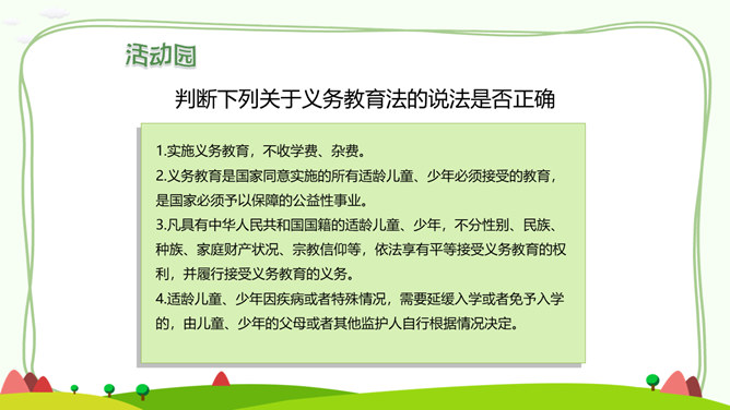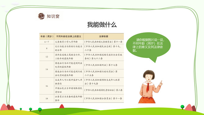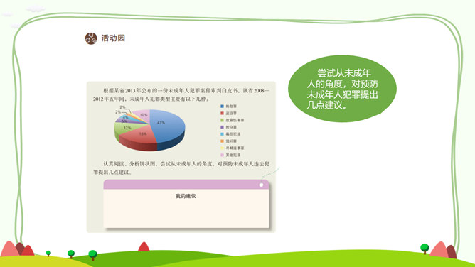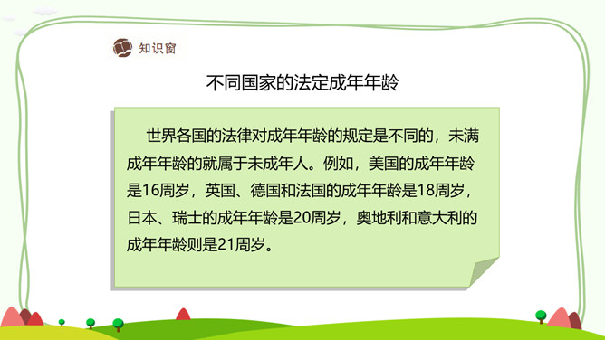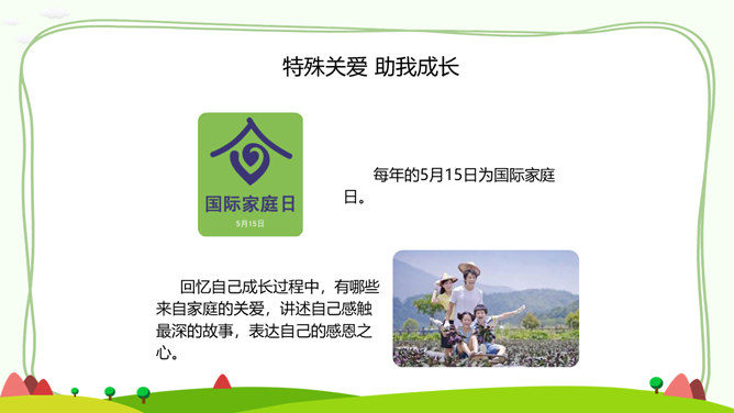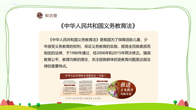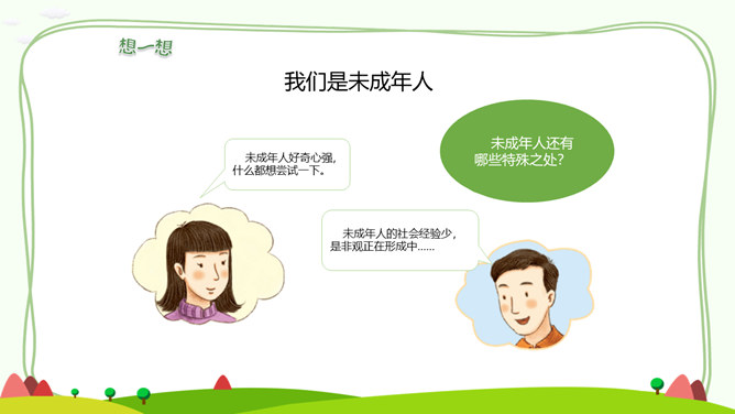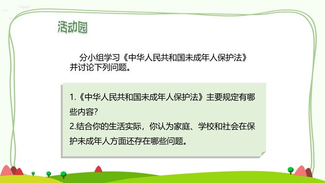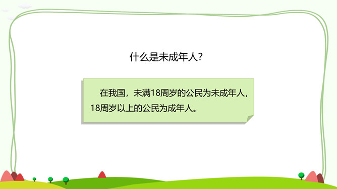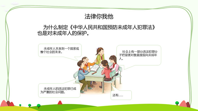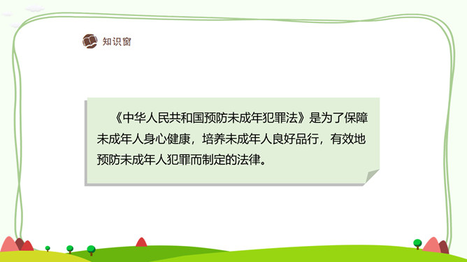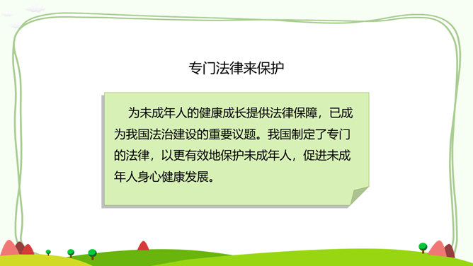 为未成年人的健康成长提供法律保障,已成为我国法治建设的重要议题。我国制定了专门的法律,以更有效地保护未成年人,促进未成年人身心健康发展。《中华人民共和国预防未成年犯罪法》是为了保障未成年人身心健康,培养未成年人良好品行,有效地预防未成年人犯罪而制定的法律。回忆自己成长过程中,有哪些来自家庭的关爱,讲述自己感触最深的故事,表达自己的感恩之心。一起分享:在你成长过程中,感受到了哪些来自社会各界的特别关怀?留守儿童在成长中还可能面临哪些问题?我们该如何关心、帮助留守儿童呢?所属专题:我们受特殊保护ppt。