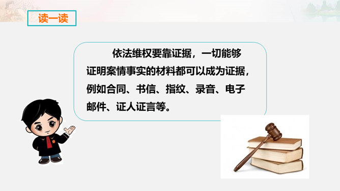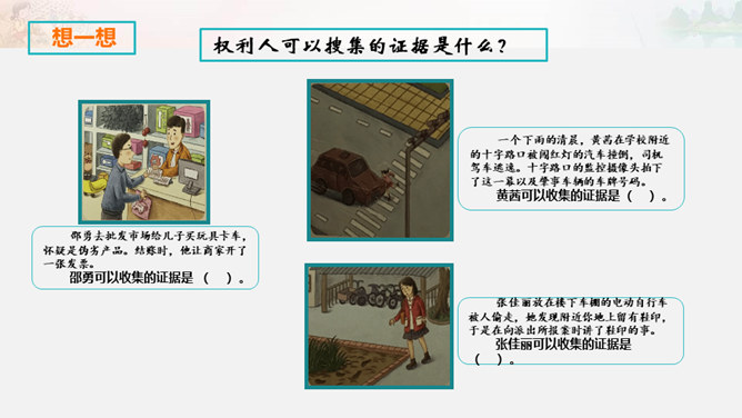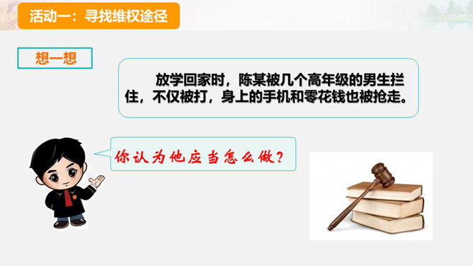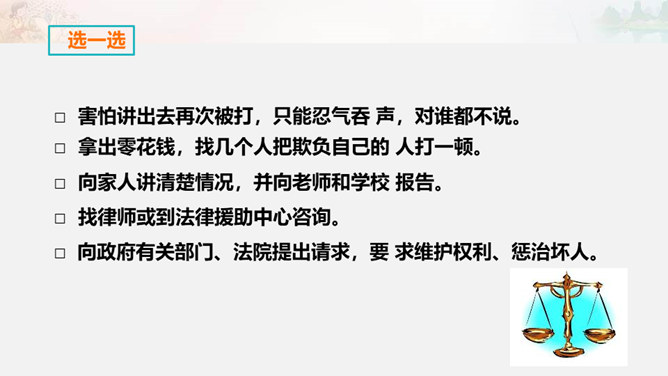 放学回家时,陈某被几个高年级的男生拦住,不仅被打,身上的手机和零花钱也被抢走。你认为他应当怎么做?害怕讲出去再次被打,只能忍气吞 声,对谁都不说。拿出零花钱,找几个人把欺负自己的 人打一顿。向家人讲清楚情况,并向老师和学校 报告。找律师或到法律援助中心咨询。向政府有关部门、法院提出请求,要 求维护权利、惩治坏人。依法维权要靠证据,一切能够证明案情事实的材料都可以成为证据,例如合同、书信、指纹、录音、电子邮件、证人证言等。所属专题:知法守法依法维权ppt。