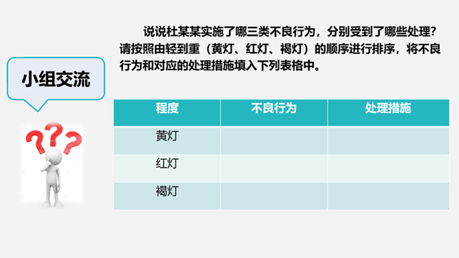 说说杜某某实施了哪三类不良行为,分别受到了哪些处理?请按照由轻到重的顺序进行排序,将不良行为和对应的处理措施填入下列表格中。握手的基本礼仪:用右手,男士手掌全部握住,女士,只握手指头部分。与长辈、上级、客人握手,长辈、上级、客人先伸手。尊者先的原则。性侵害未成年人是非常严重的犯罪。刑法规定,奸淫幼女的,构成强奸罪,从重处罚;猥亵儿童的,构成猥亵儿童罪,从重处罚。未成年人要加强自我预防意识,远离侵害,学会自卫。在出现性侵害事件后,应当立即向父母、学校报告,由有关部门追究其法律责任。所属专题:知法守法依法维权ppt。