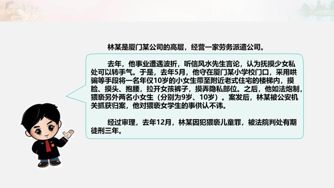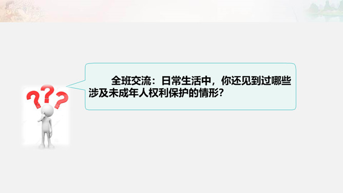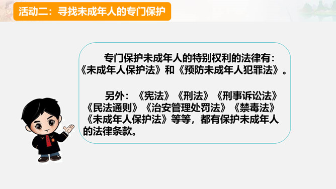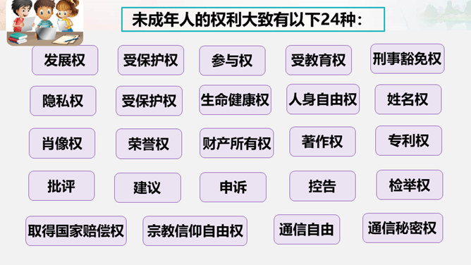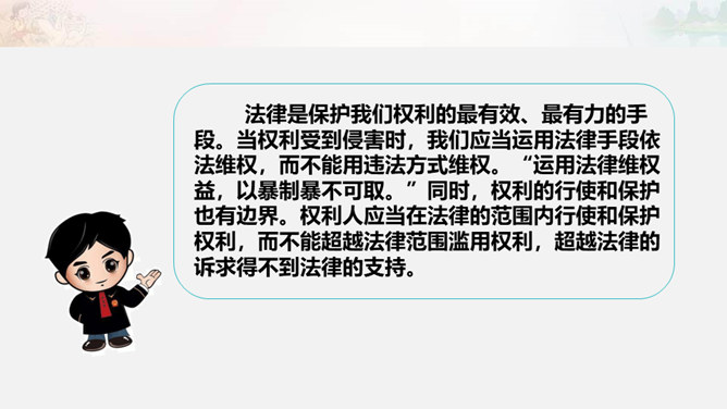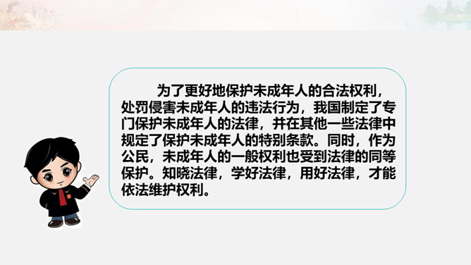 为了更好地保护未成年人的合法权利,处罚侵害未成年人的违法行为,我国制定了专门保护未成年人的法律,并在其他一些法律中规定了保护未成年人的特别条款。同时,作为公民,未成年人的一般权利也受到法律的同等保护。知晓法律,学好法律,用好法律,才能依法维护权利。公民享有人身权、财产权、选举权和被选举权、受教育权以及参与经济、文化、社会生活等各项权利。宪法、民法、刑法、行政法等各部门法,从各个角度、各个方面,对公民的权利进行全方位的保护。在公民权利受到侵害时,应当运用相应的法律维护自身权利。所属专题:知法守法依法维权ppt。