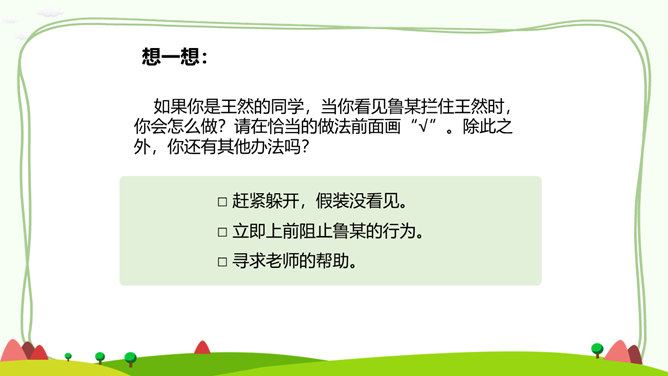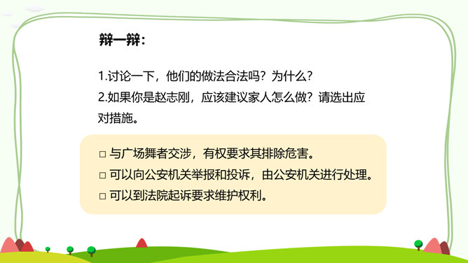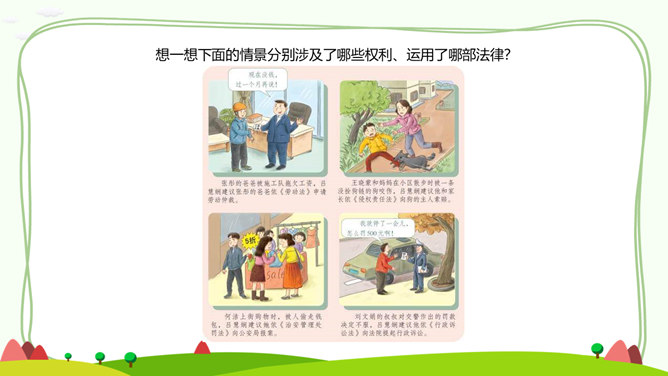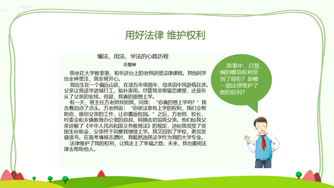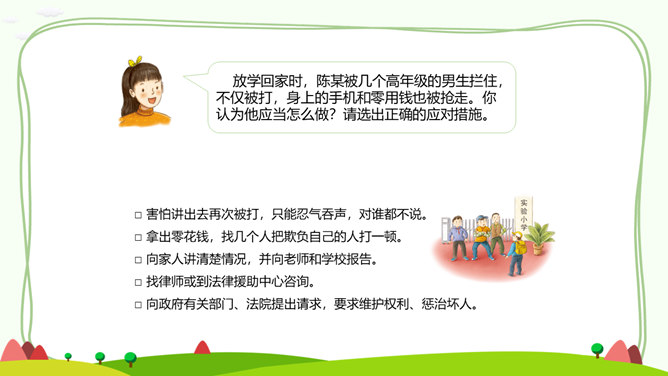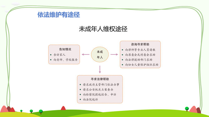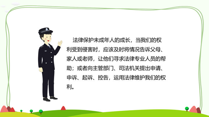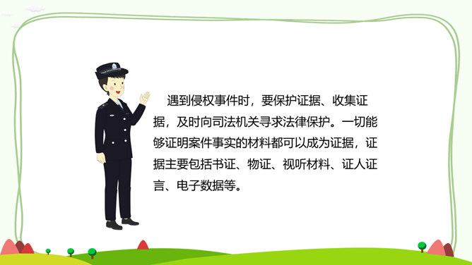 法律保护未成年人的成长,当我们的权利受到侵害时,应该及时将情况告诉父母、家人或老师,让他们寻求法律专业人员的帮助;或者向主管部门、司法机关提出申请、申诉、起诉、控告,运用法律维护我们的权利。遇到侵权事件时,要保护证据、收集证据,及时向司法机关寻求法律保护。一切能够证明案件事实的材料都可以成为证据,证据主要包括书证、物证、视听材料、证人证言、电子数据等。所属专题:知法守法依法维权ppt。