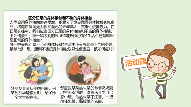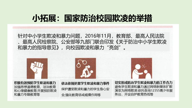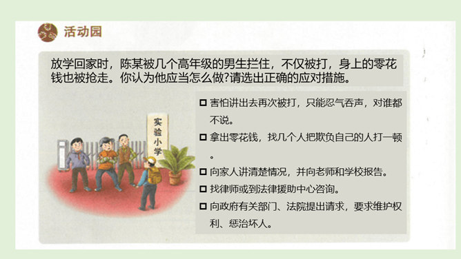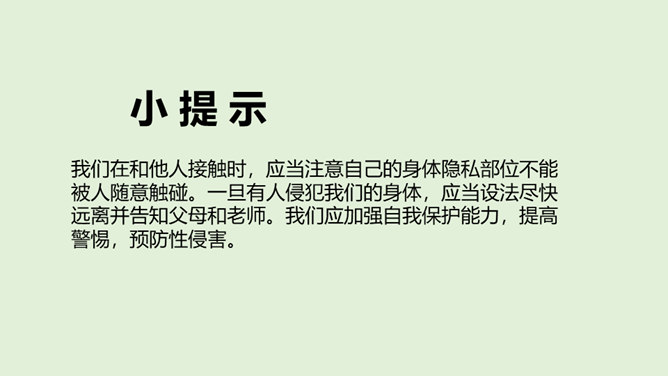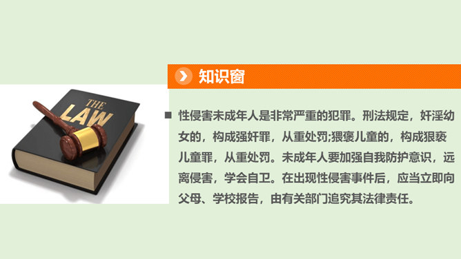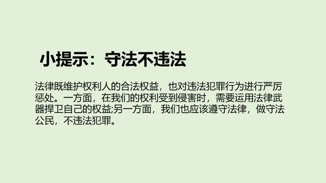 法律既维护权利人的合法权益,也对违法犯罪行为进行严厉惩处。一方面,在我们的权利受到侵害时,需要运用法律武器捍卫自己的权益;另一方面,我们也应该遵守法律,做守法公民,不违法犯罪。我们在和他人接触时,应当注意自己的身体隐私部位不能被人随意触碰。一旦有人侵犯我们的身体,应当设法尽快远离并告知父母和老师。我们应加强自我保护能力,提高警惕,预防性侵害。法律保护未成年人的成长。当我们的权利受到侵害时,应该及时将情况告诉家人或老师,寻求法律专业人员的帮助,向有关部门寻求保护,运用法律维护我们的权利。所属专题:知法守法依法维权ppt。