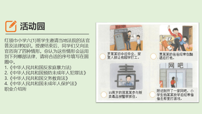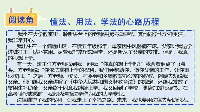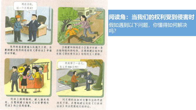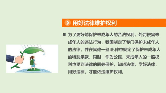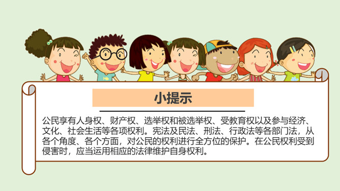 公民享有人身权、财产权、选举权和被选举权、受教育权以及参与经济、文化、社会生活等各项权利。宪法及民法、刑法、行政法等各部门法,从各个角度、各个方面,对公民的权利进行全方位的保护。在公民权利受到侵害时,应当运用相应的法律维护自身权利。未成年人除了享有公民的一般权利之外,还享有法律规定的其他特别权利,如接受义务教育的权利等。法律对未成年人的保护,还体现在对未成年人犯罪的预防方面:通过对实施不良行为的未成年人进行及时教育、矫治,将未成年人与可能诱发犯罪的环境隔离开来,以保护其健康成长。所属专题:知法守法依法维权ppt。