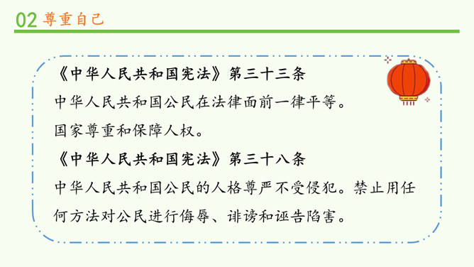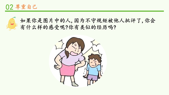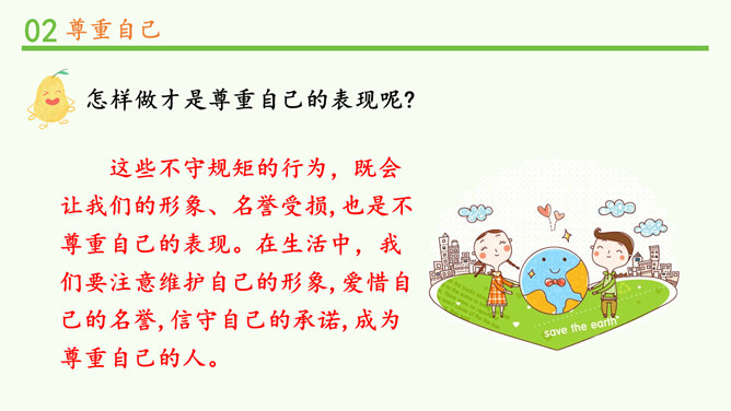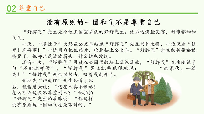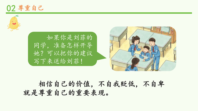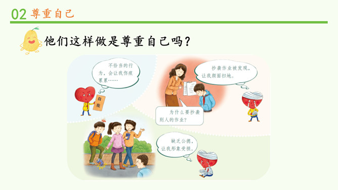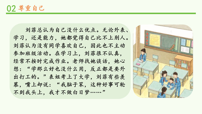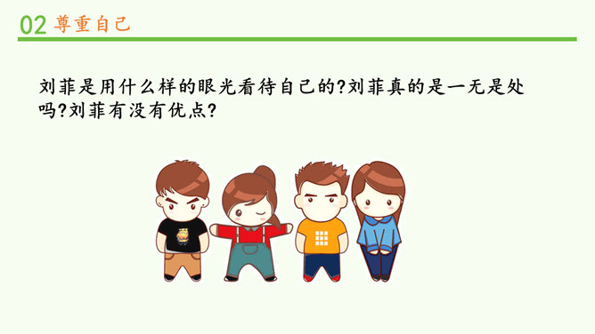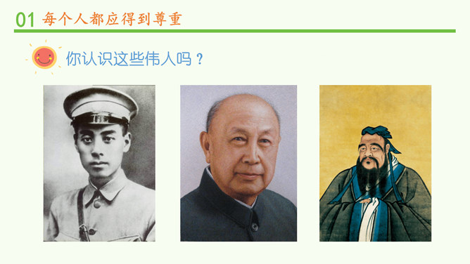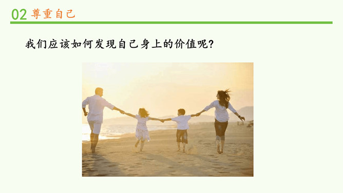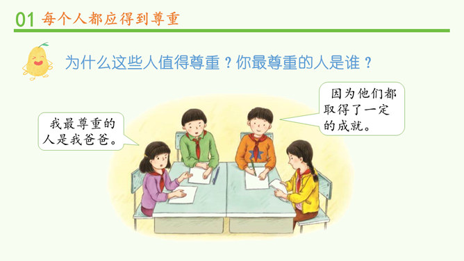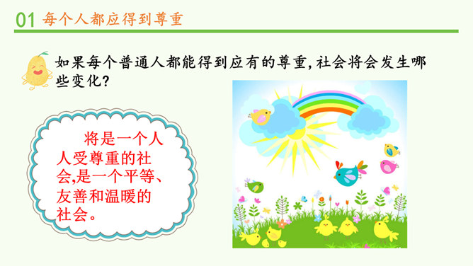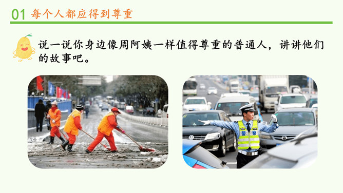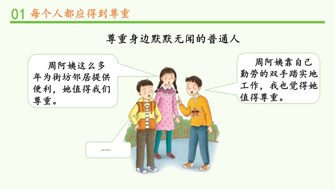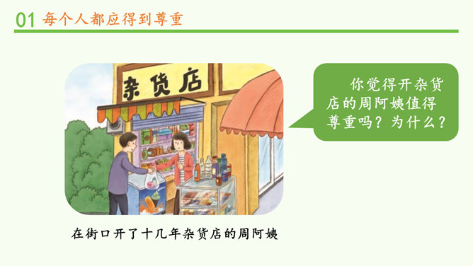 为什么这些人值得尊重?你最尊重的人是谁?因为他们都取得了一定的成就。我最尊重的人是我爸爸。你觉得开杂货店的周阿姨值得尊重吗?为什么?周阿姨这么多年为街坊邻居提供便利,她值得我们尊重。周阿姨靠自己勤劳的双手踏实地工作,我也觉得她值得尊重。说一说你身边像周阿姨一样值得尊重的普通人,讲讲他们的故事吧。如果每个普通人都能得到应有的尊重,社会将会发生哪些变化?将是一个人人受尊重的社会,是一个平等、友善和温暖的社会。相信自己的价值,不自我贬低,不自卑就是尊重自己的重要表现。所属专题:学会尊重ppt。