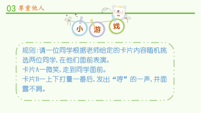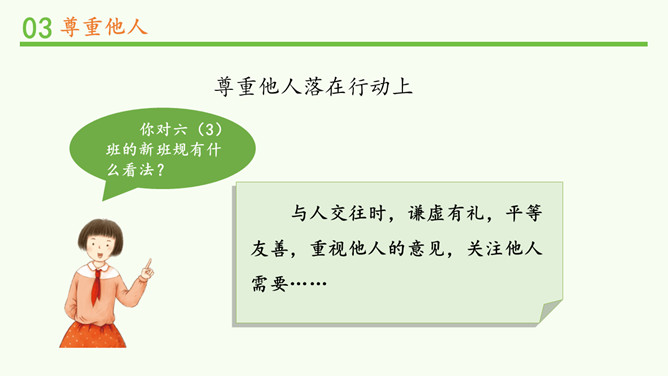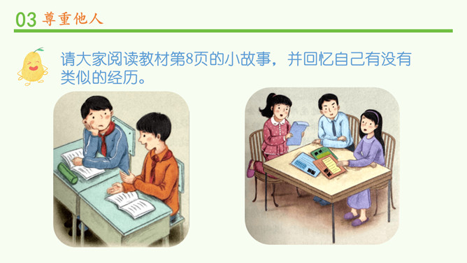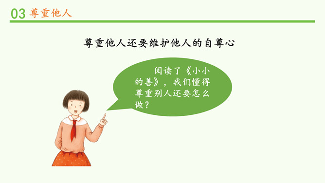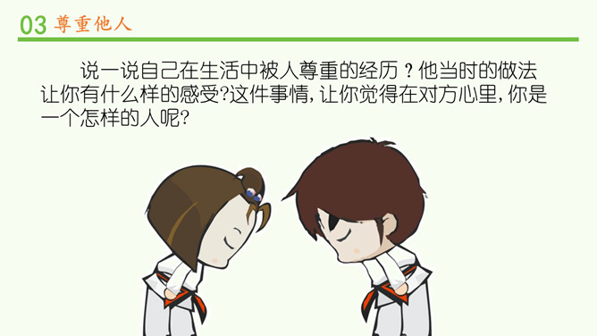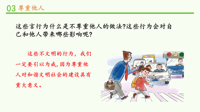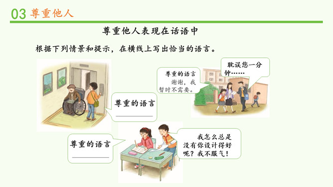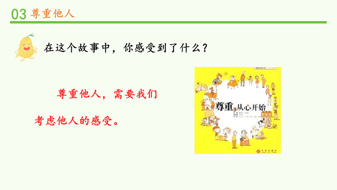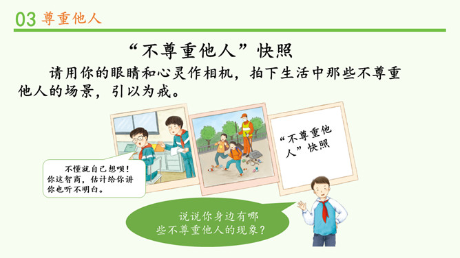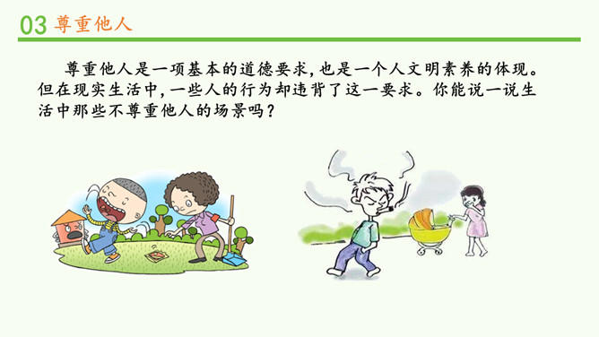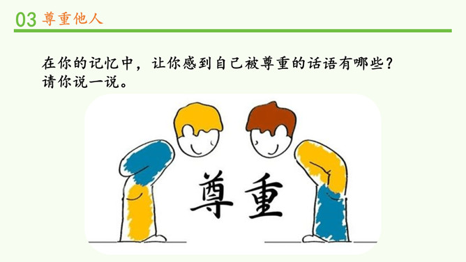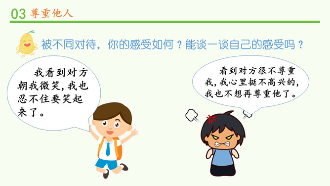 被不同对待,你的感受如何?能谈一谈自己的感受吗?我看到对方朝我微笑,我也忍不住要笑起来了。看到对方很不尊重我,我心里挺不高兴的,我也不想再尊重他了。请大家阅读教材的小故事,并回忆自己有没有类似的经历。说一说自己在生活中被人尊重的经历?他当时的做法让你有什么样的感受?这件事情,让你觉得在对方心里,你是一个怎样的人呢?尊重他人是一项基本的道德要求,也是一个人文明素养的体现。但在现实生活中,一些人的行为却违背了这一要求。你能说一说生活中那些不尊重他人的场景吗?所属专题:学会尊重ppt。