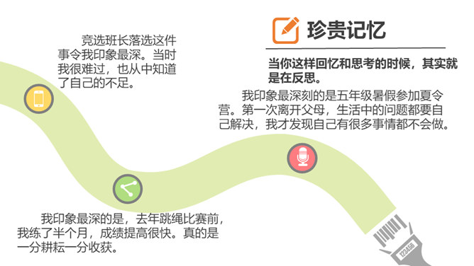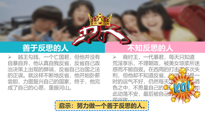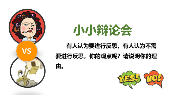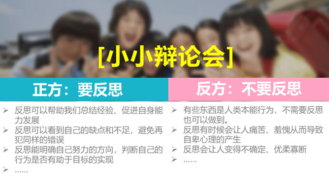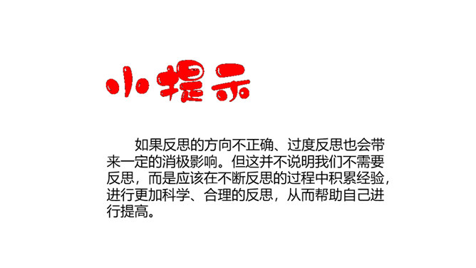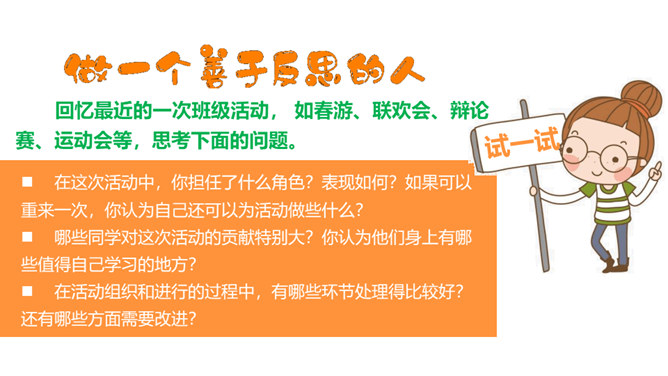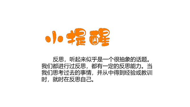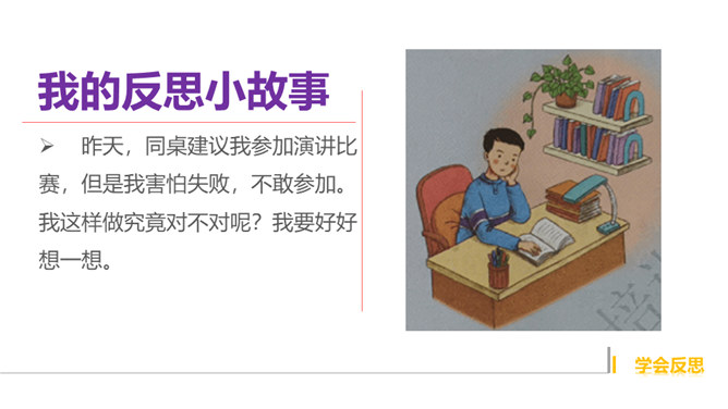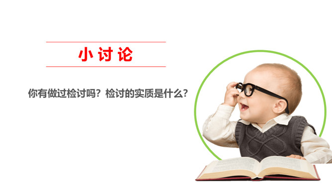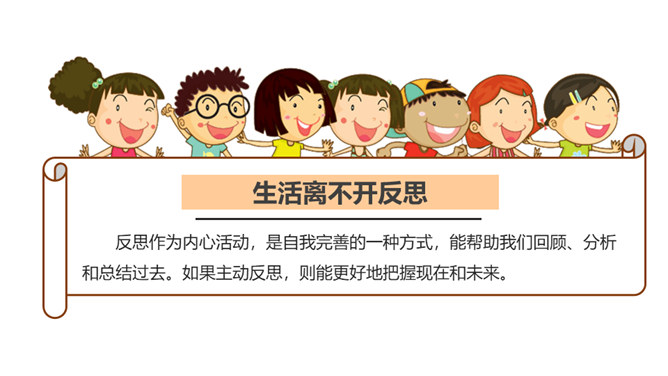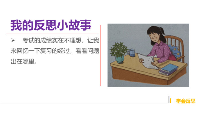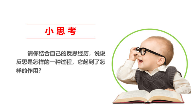 你有做过检讨吗?检讨的实质是什么?当你这样回忆和思考的时候,其实就是在反思。反思,听起来似乎是一个很抽象的话题。我们都进行过反思,都有一定的反思能力。当我们思考过去的事情,并从中得到经验或教训时,就时在反思自己。小小分享会:1、在平常的生活中,你喜欢反思吗?你会通过哪些方式进行反思?2、你有过反思的经历吗,你所反思的是什么事情,经历了怎样的思考?请你结合自己的反思经历,说说反思是怎样的一种过程,它起到了怎样的作用?反思作为内心活动,是自我完善的一种方式。所属专题:学会反思ppt。