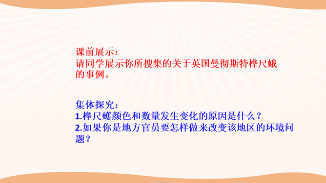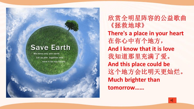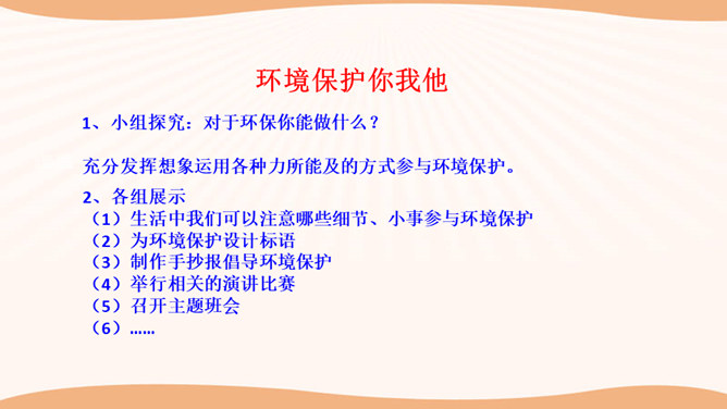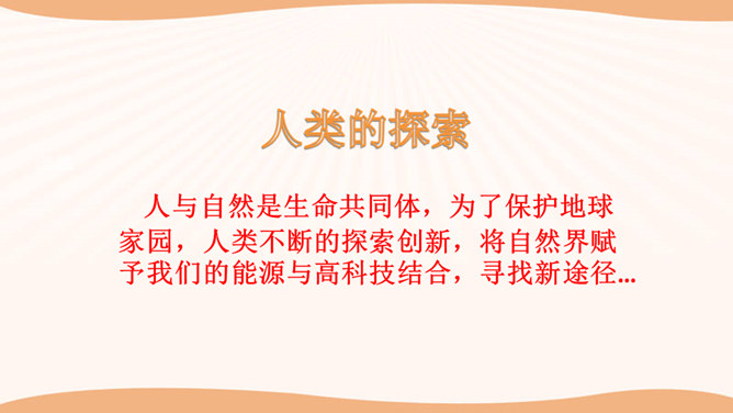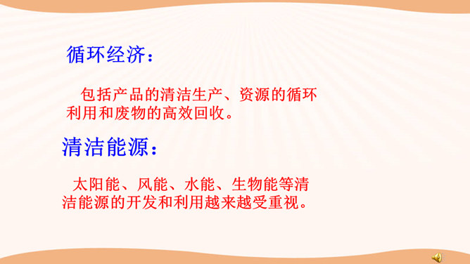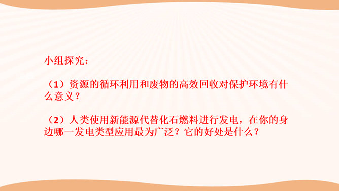 人与自然是生命共同体,为了保护地球家园,人类不断的探索创新,将自然界赋予我们的能源与高科技结合,寻找新途径…循环经济:包括产品的清洁生产、资源的循环利用和废物的高效回收。清洁能源:太阳能、风能、水能、生物能等清洁能源的开发和利用越来越受重视。小组探究:(1)资源的循环利用和废物的高效回收对保护环境有什么意义?(2)人类使用新能源代替化石燃料进行发电,在你的身边哪一发电类型应用最为广泛?它的好处是什么?小组探究:对于环保你能做什么?充分发挥想象运用各种力所能及的方式参与环境保护。所属专题:地球我们的家园ppt。