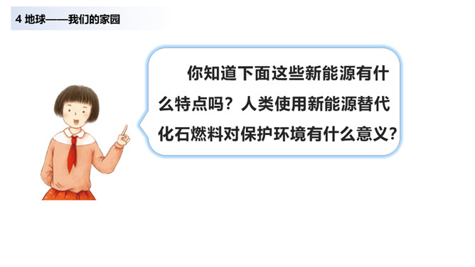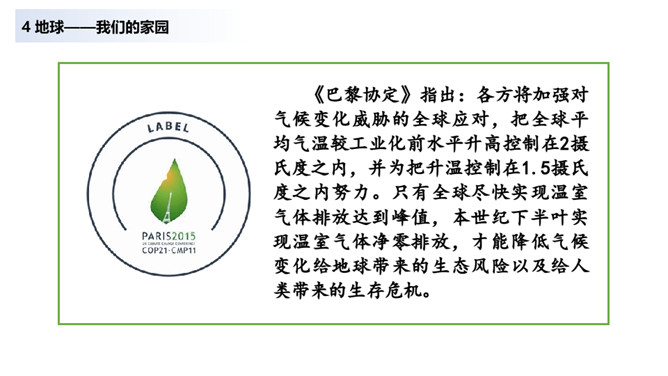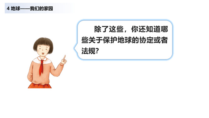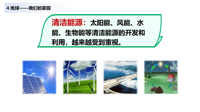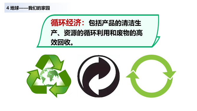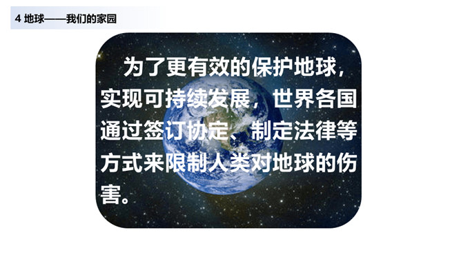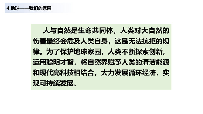 同学们,通过上节课的学习,我们认识到地球是我们人类赖以生存的家园,一旦地球被破坏,我们人类将别无去处,因此,保护地球是全人类共同的责任。为了更有效的保护地球,实现可持续发展,世界各国通过签订协定、制定法律等方式来限制人类对地球的伤害。人与自然是生命共同体,人类对大自然的伤害最终会危及人类自身,这是无法抗拒的规律。为了保护地球家园,人类不断探索创新,运用聪明才智,将自然界赋予人类的清洁能源和现代高科技相结合,大力发展循环经济,实现可持续发展。所属专题:地球我们的家园ppt。