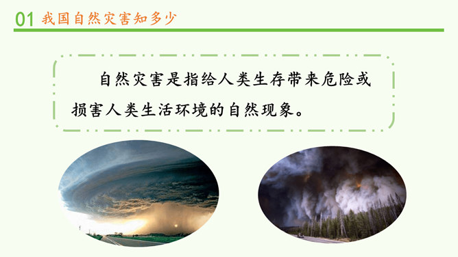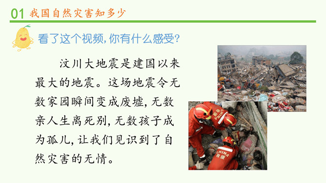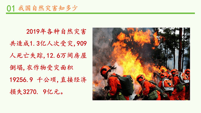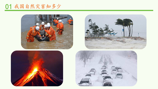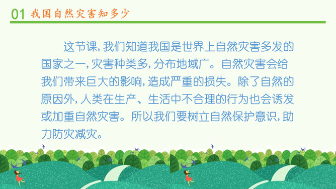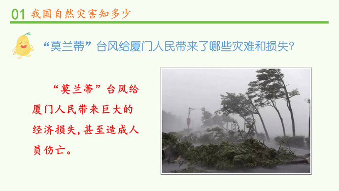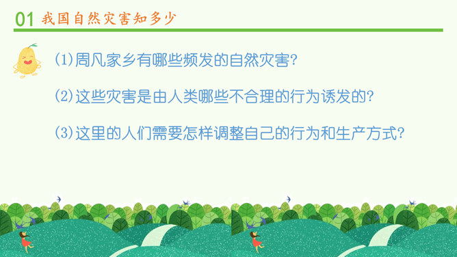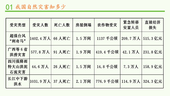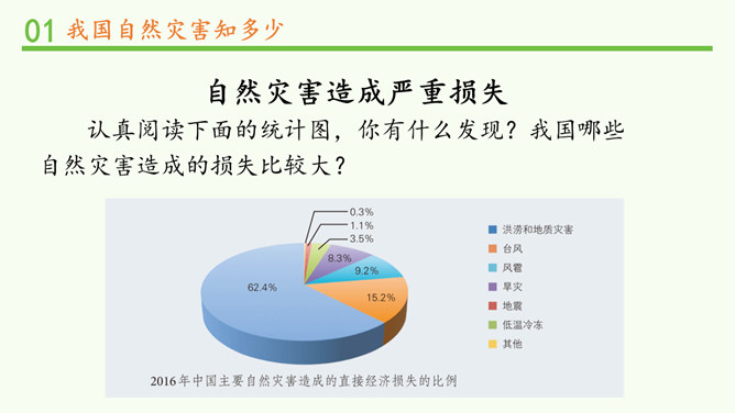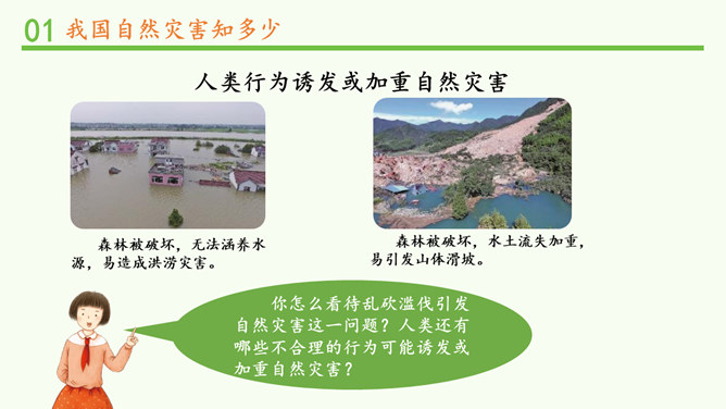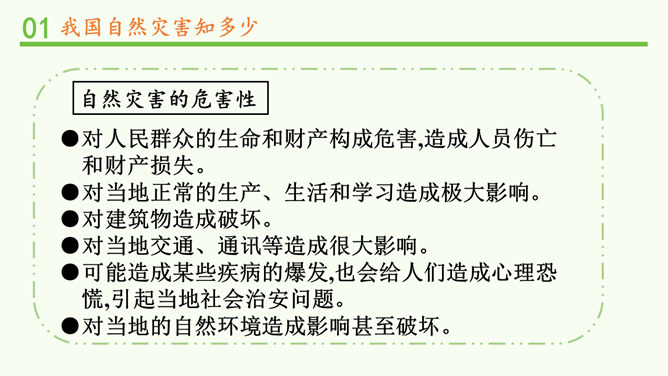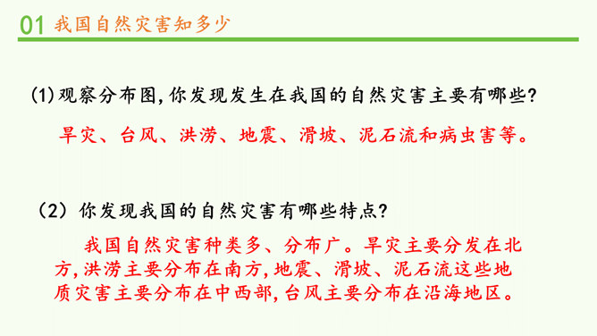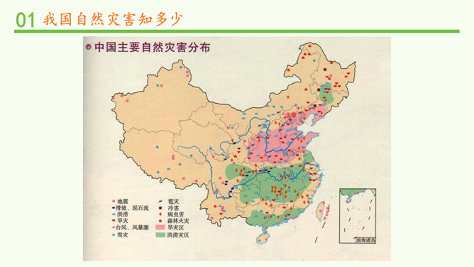 观察分布图,你发现发生在我国的自然灾害主要有哪些?旱灾、台风、洪涝、地震、滑坡、泥石流和病虫害等。你发现我国的自然灾害有哪些特点? 我国自然灾害种类多、分布广。旱灾主要分发在北方,洪涝主要分布在南方,地震、滑坡、泥石流这些地质灾害主要分布在中西部,台风主要分布在沿海地区。这节课,我们知道我国是世界上自然灾害多发的国家之一,灾害种类多,分布地域广。自然灾害会给我们带来巨大的影响,造成严重的损失。除了自然的原因外,人类在生产、生活中不合理的行为也会诱发或加重自然灾害。所以我们要树立自然保护意识,助力防灾减灾。所属专题:应对自然灾害ppt。
