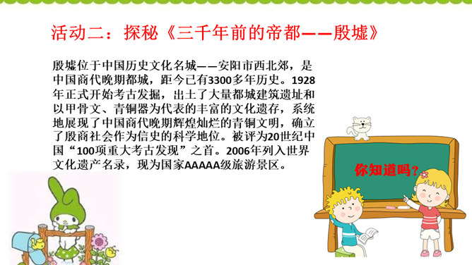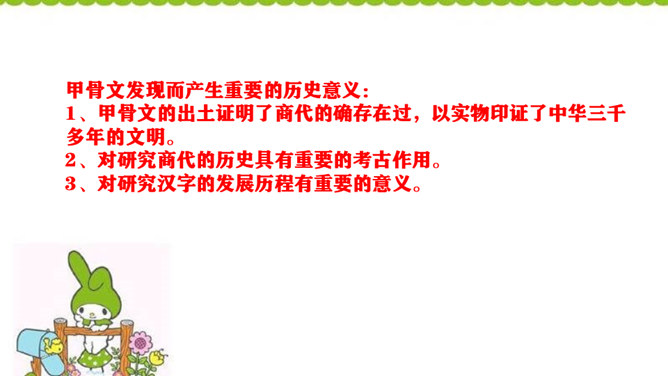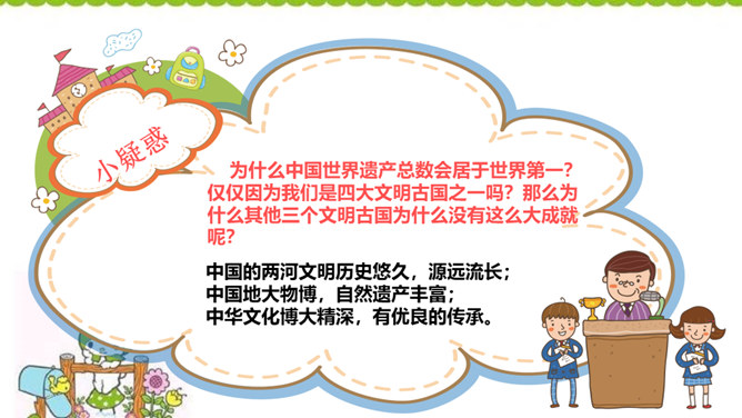 为什么中国世界遗产总数会居于世界第一?仅仅因为我们是四大文明古国之一吗?那么为什么其他三个文明古国为什么没有这么大成就呢?中国的两河文明历史悠久,源远流长;中国地大物博,自然遗产丰富;中华文化博大精深,有优良的传承。甲骨文发现而产生重要的历史意义:1、甲骨文的出土证明了商代的确存在过,以实物印证了中华三千多年的文明。2、对研究商代的历史具有重要的考古作用。3、对研究汉字的发展历程有重要的意义。以青铜器为代表的殷墟文物证明商朝的青铜冶炼技术已经非常发达,著名的司母戊鼎就是其中的杰出代表。所属专题:探访古代文明ppt。