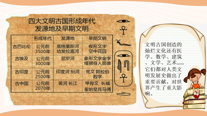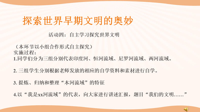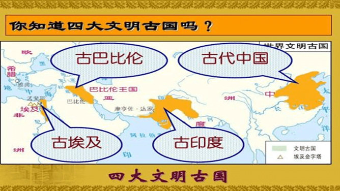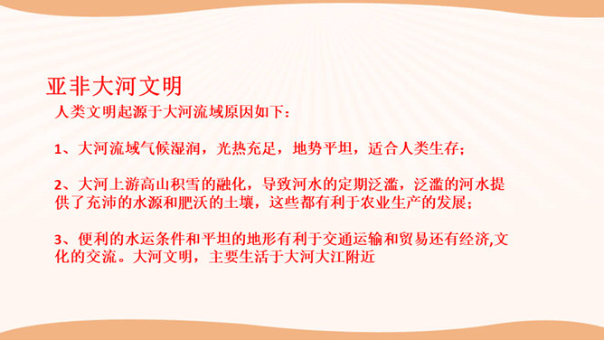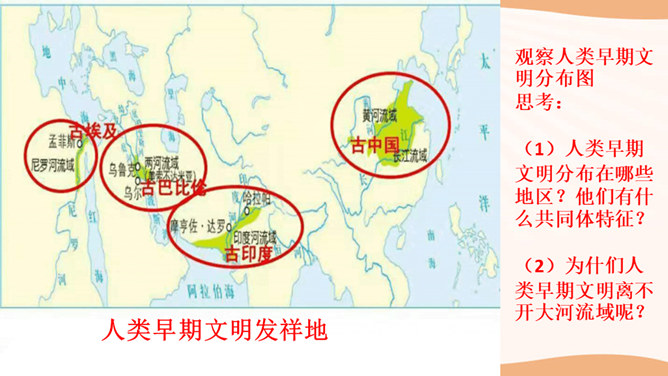 观察人类早期文明分布图思考:(1)人类早期文明分布在哪些地区?他们有什么共同体特征?(2)为什们人类早期文明离不开大河流域呢?人类文明起源于大河流域原因如下:1、大河流域气候湿润,光热充足,地势平坦,适合人类生存;2、大河上游高山积雪的融化,导致河水的定期泛滥,泛滥的河水提供了充沛的水源和肥沃的土壤,这些都有利于农业生产的发展;3、便利的水运条件和平坦的地形有利于交通运输和贸易还有经济,文化的交流。大河文明,主要生活于大河大江附近。中国境内还有哪些的河流?为什么只有黄河和长江被称为“母亲河”?所属专题:探访古代文明ppt。