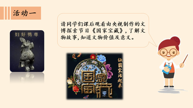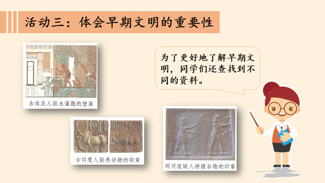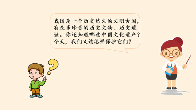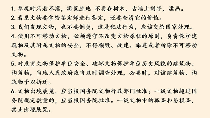 我国是一个历史悠久的文明古国,有众多珍贵的历史文物、历史遗址。今天,我们又该怎样保护它们?1.参观时只看不摸,游览胜地 不要在树木,古墙上刻字,滥画。2.看见文物要拿给鉴定师进行鉴定,还要查清它的价值。3.我们发现文物,也不要倒卖,这是犯法行为,应该交给国家处理。4.使用不可移动文物,必须遵守不改变文物原状的原则,负责保护建筑物及其附属文物的安全,不得损毁、改建、添建或者拆除不可移动文物。5.对危害文物保护单位安全、破坏文物保护单位历史风貌的建筑物、构筑物,当地人民政府应当及时调查处理。所属专题:探访古代文明ppt。
