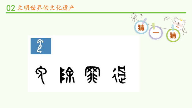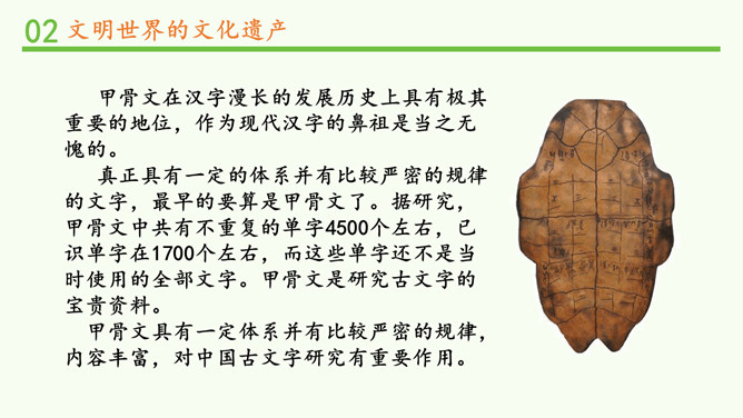 世界文化遗产,是一项由联合国发起、联合国教育科学文化组织负责执行的国际公约建制,以保存对全世界人类都具有杰出普遍性价值的自然或文化处所为目的。世界文化遗产是文化的保护与传承的最高等级,世界文化遗产属于世界遗产范畴。甲骨文在汉字漫长的发展历史上具有极其重要的地位,作为现代汉字的鼻祖是当之无愧的。真正具有一定的体系并有比较严密的规律的文字,最早的要算是甲骨文了。据研究,甲骨文中共有不重复的单字4500个左右,已识单字在1700个左右,而这些单字还不是当时使用的全部文字。甲骨文是研究古文字的宝贵资料。所属专题:探访古代文明ppt。