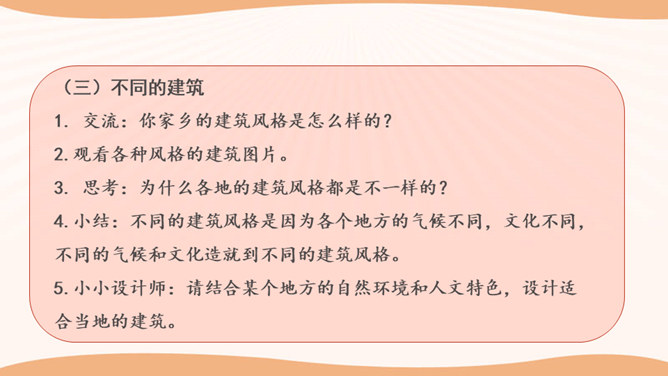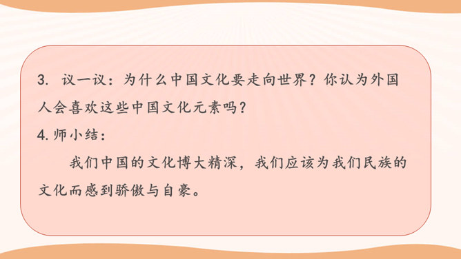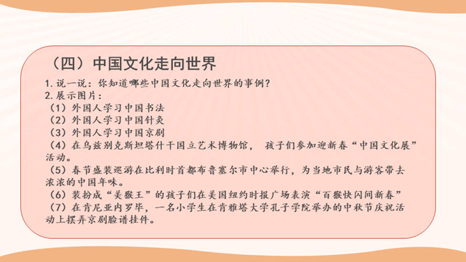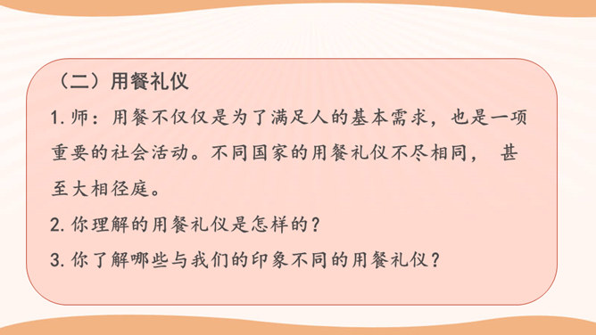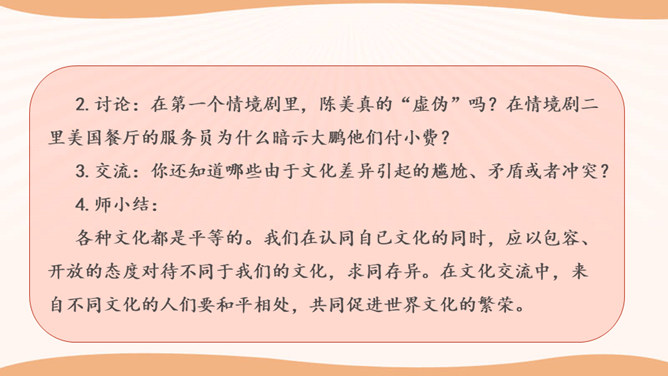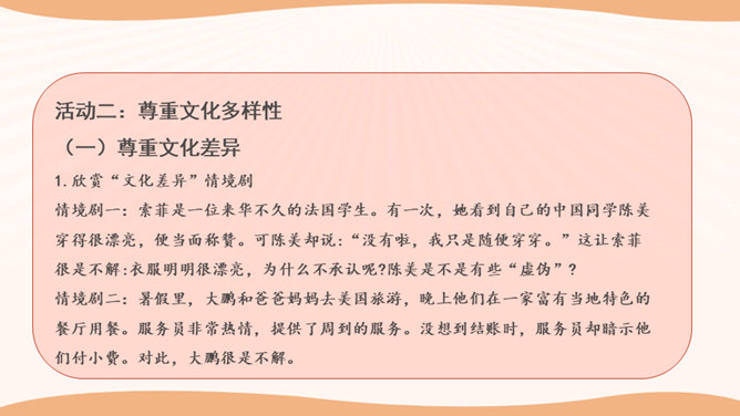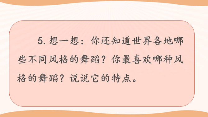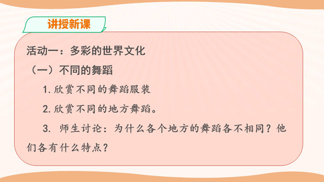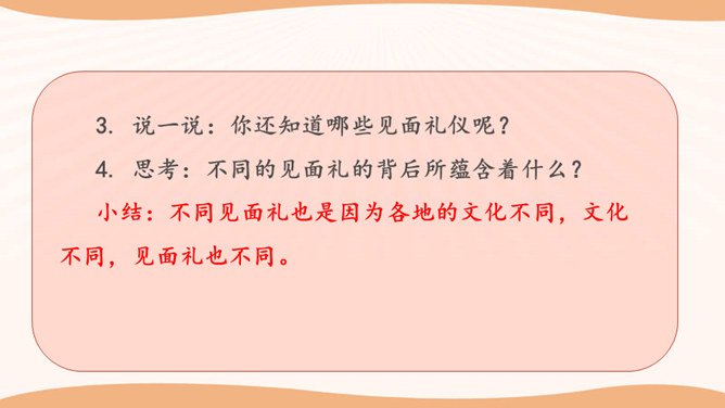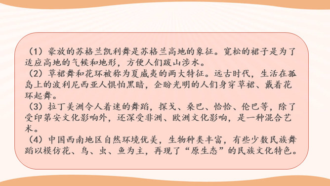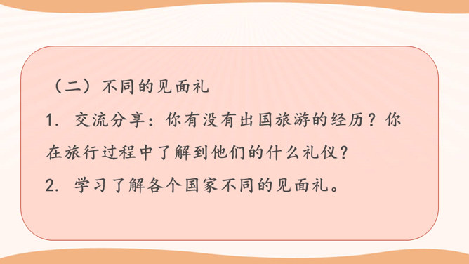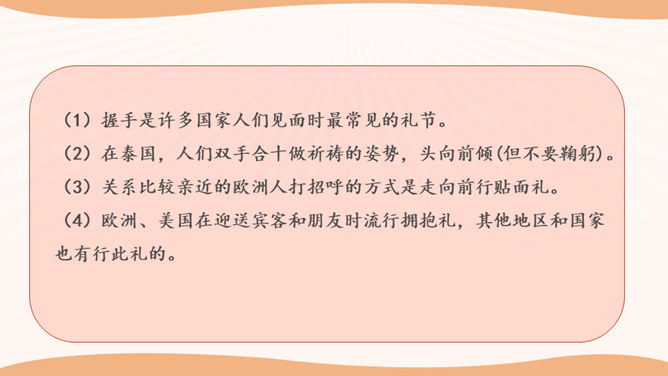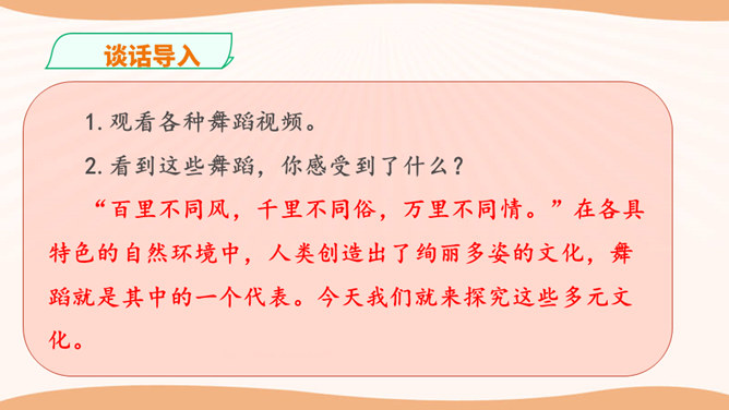 “百里不同风,千里不同俗,万里不同情。”在各具特色的自然环境中,人类创造出了绚丽多姿的文化,舞蹈就是其中的一个代表。今天我们就来探究这些多元文化。想一想:你还知道世界各地哪些不同风格的舞蹈?你最喜欢哪种风格的舞蹈?说说它的特点。交流分享:你有没有出国旅游的经历?你在旅行过程中了解到他们的什么礼仪?学习了解各个国家不同的见面礼。(1)握手是许多国家人们见面时最常见的礼节。(2)在泰国,人们双手合十做祈祷的姿势,头向前倾(但不要鞠躬)。(3)关系比较亲近的欧洲人打招呼的方式是走向前行贴面礼。所属专题:多元文化多样魅力ppt。